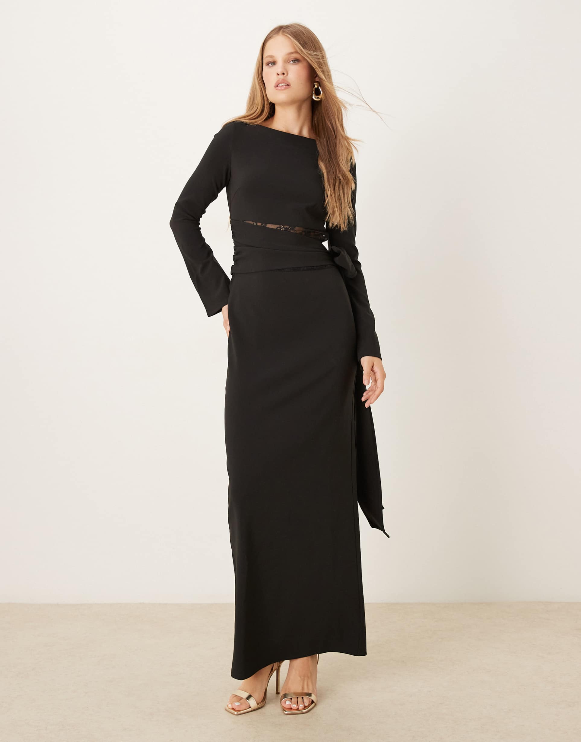 Soft jersey knit fabric creates a sleek and sophisticated silhouette in this black column maxi dress. Featuring a classic boat neck and long sleeves, it offers a regular fit that skims the body gracefully. Delicate lace inserts and a charming bow detail at the bodice add elegant texture and feminine appeal. The side zipper closure and subtle kick slit hemline enhance comfort and movement, making it an ideal choice for formal occasions, cocktail parties, or romantic date nights during cooler seasons.