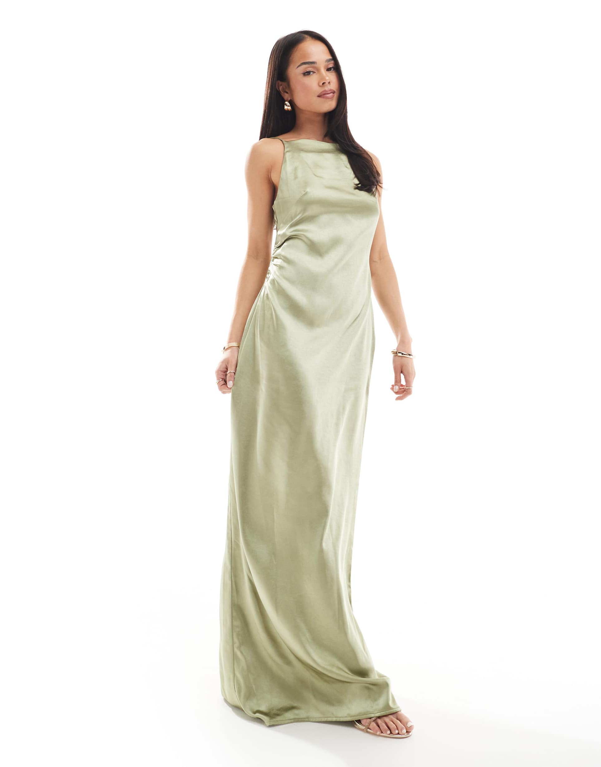 Glossy satin in a matte olive hue forms this elegant column maxi dress featuring a sophisticated boat neck and sleeveless styling. The regular fit skims the silhouette gracefully, enhanced by adjustable straps and a side slit for ease of movement. Finished with a clean hemline and side zipper closure, it suits formal occasions, wedding bridesmaids, and cocktail events alike with timeless charm and smooth, silky texture.