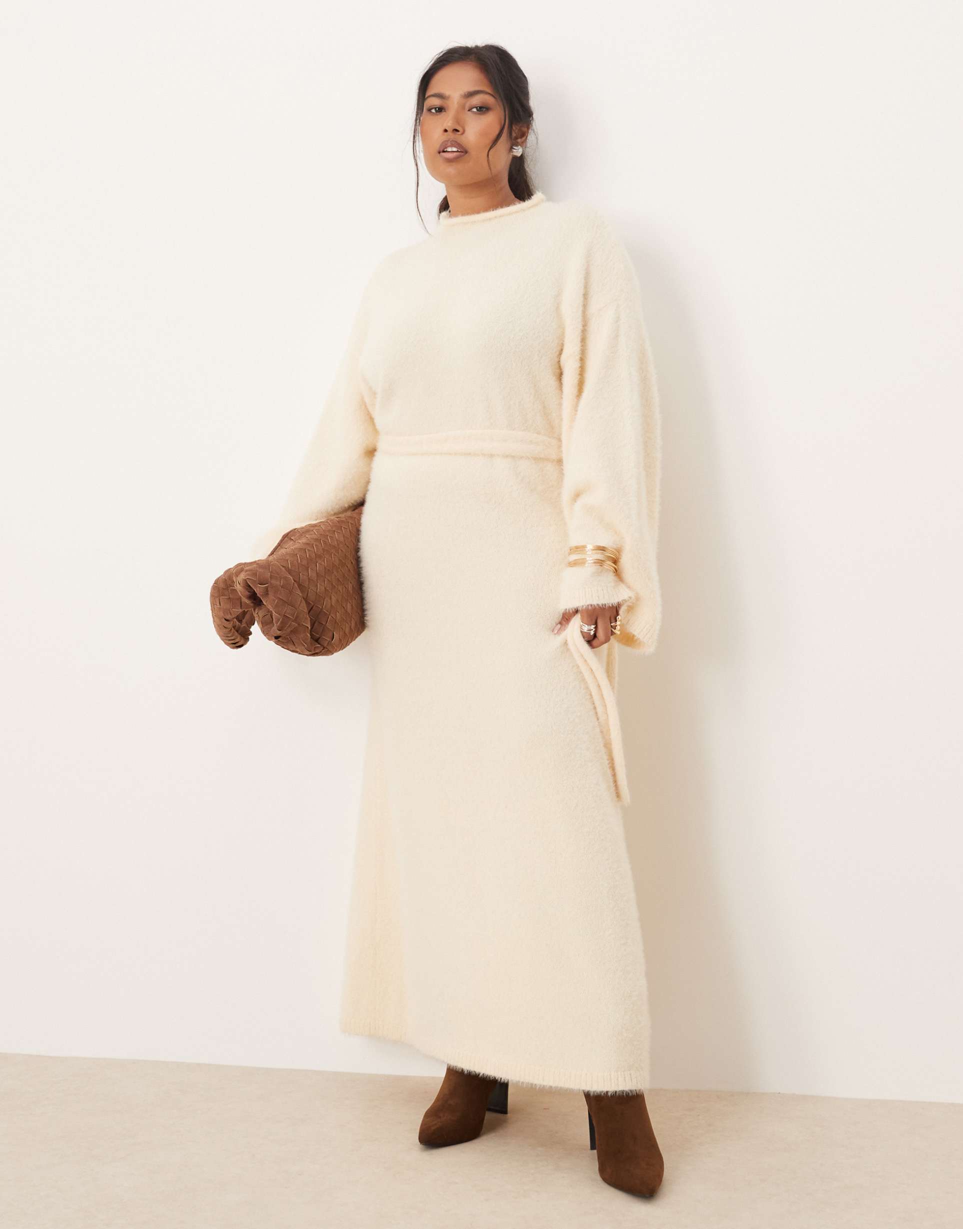 PRETTY LAVISH CURVE FLUFFY TIE WAIST KNIT MIDAXI SWEATER DRESS IN CREAM