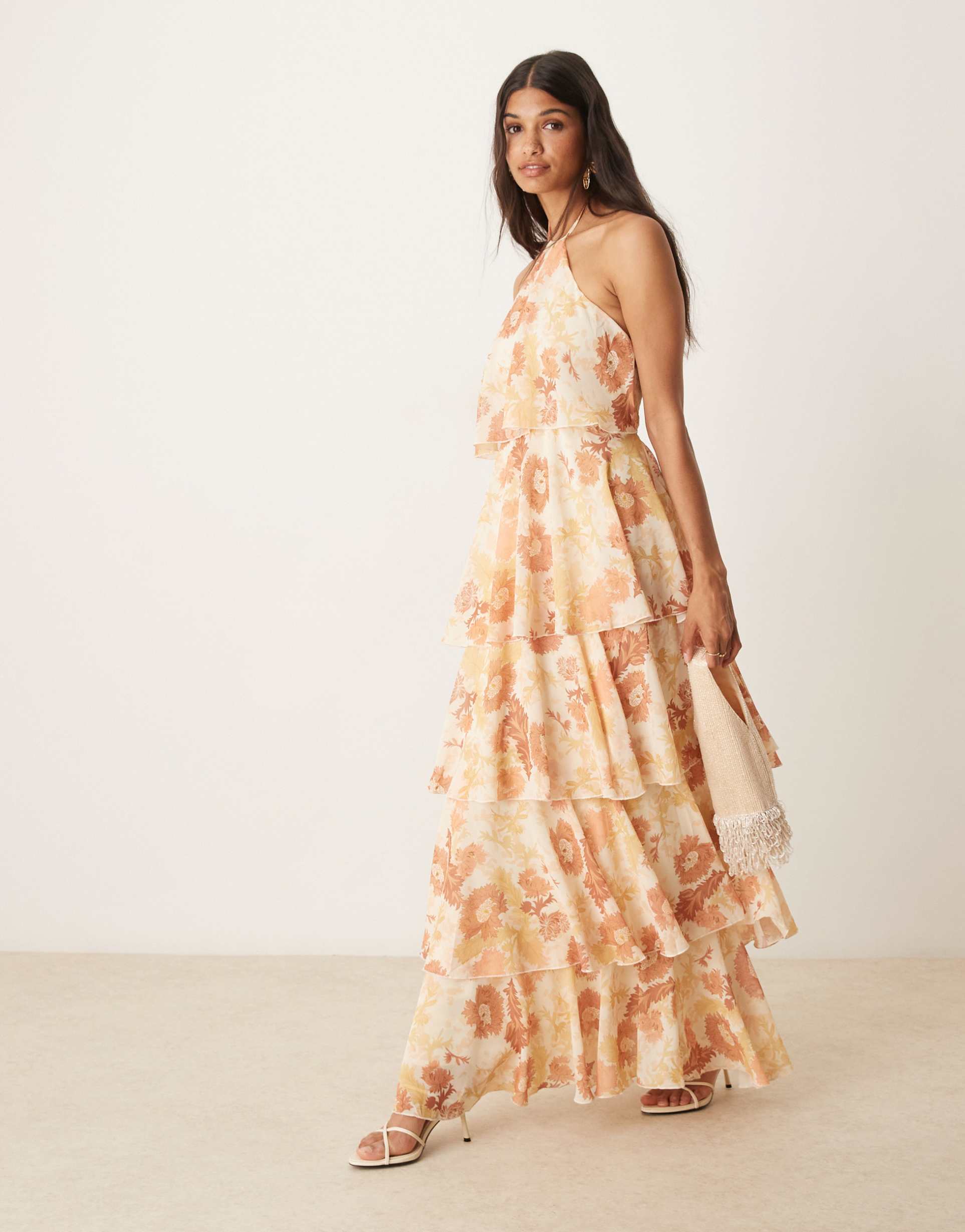 Soft terracotta petals decorate this flowing maxi dress with a romantic tiered silhouette. The halter neck and open back highlight a flattering regular fit, perfect for warm spring and summer days. Crafted from lightweight polyester, the dress features delicate ruffles layered throughout, adding elegant movement to the airy design. Ideal for brunches, date nights, or cocktail events, this dress combines feminine charm with versatile sophistication.
