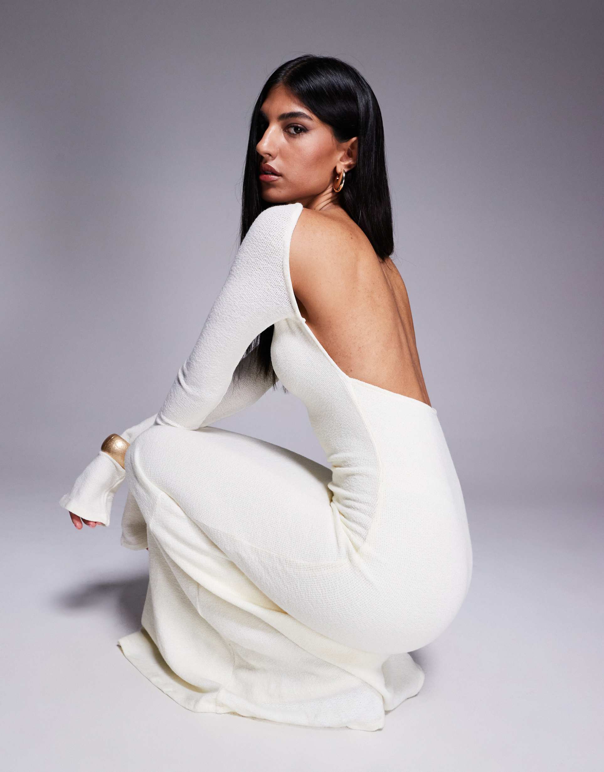 Soft textured knit fabric in a matte charcoal shade defines this elegant column silhouette maxi dress. Featuring a boat neckline and long regular sleeves, it balances modesty with a daring open back that adds a modern edge. The regular fit skims the body comfortably, making it perfect for autumn and winter occasions. Ideal for cocktail parties, date nights, or evening outings, this slip-on dress offers understated sophistication with a clean hemline and stretch-enhanced comfort.