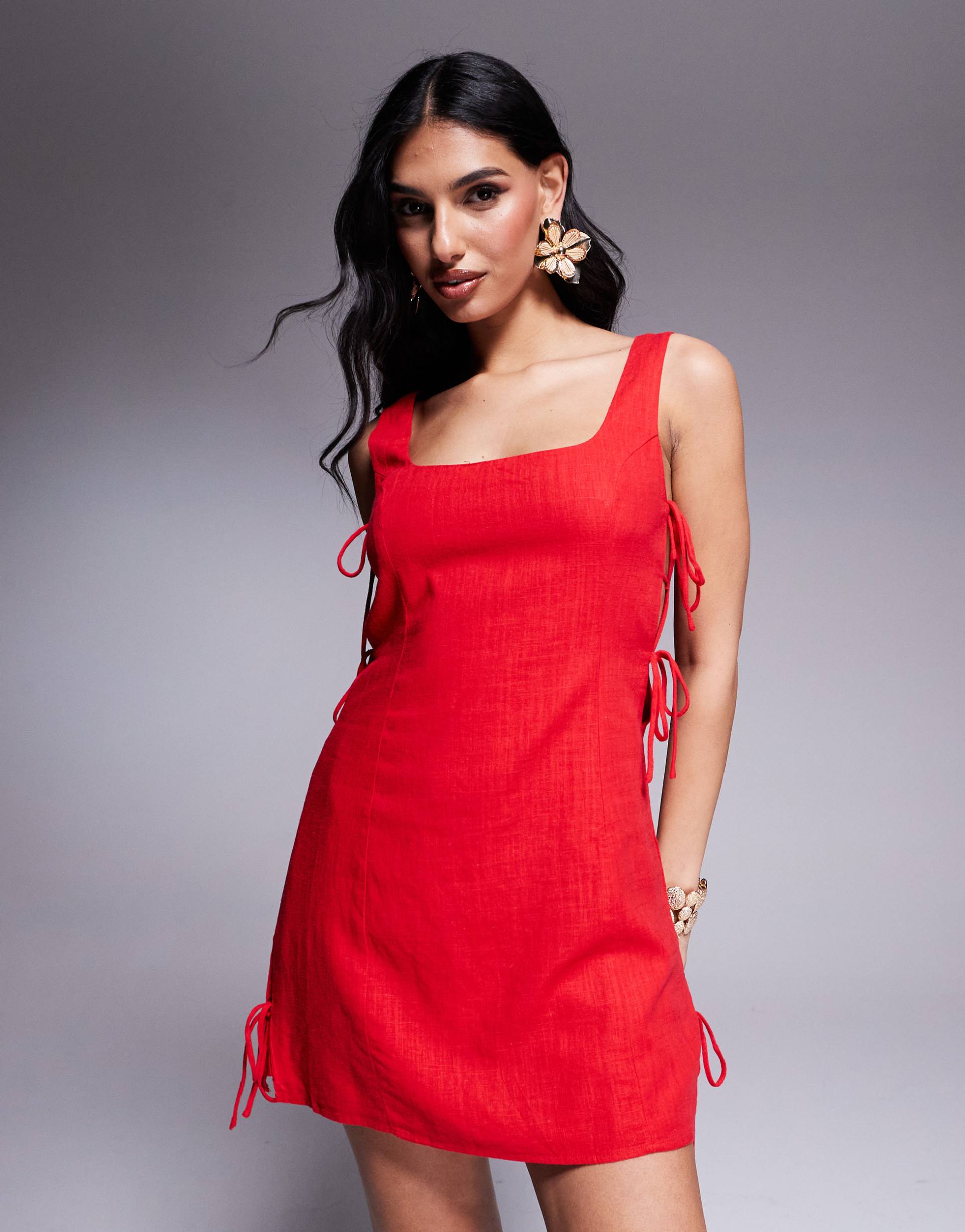 PRINCESS POLLY LINEN LOOK SQUARE NECK OPEN TIE SIDES MINI DRESS IN RED