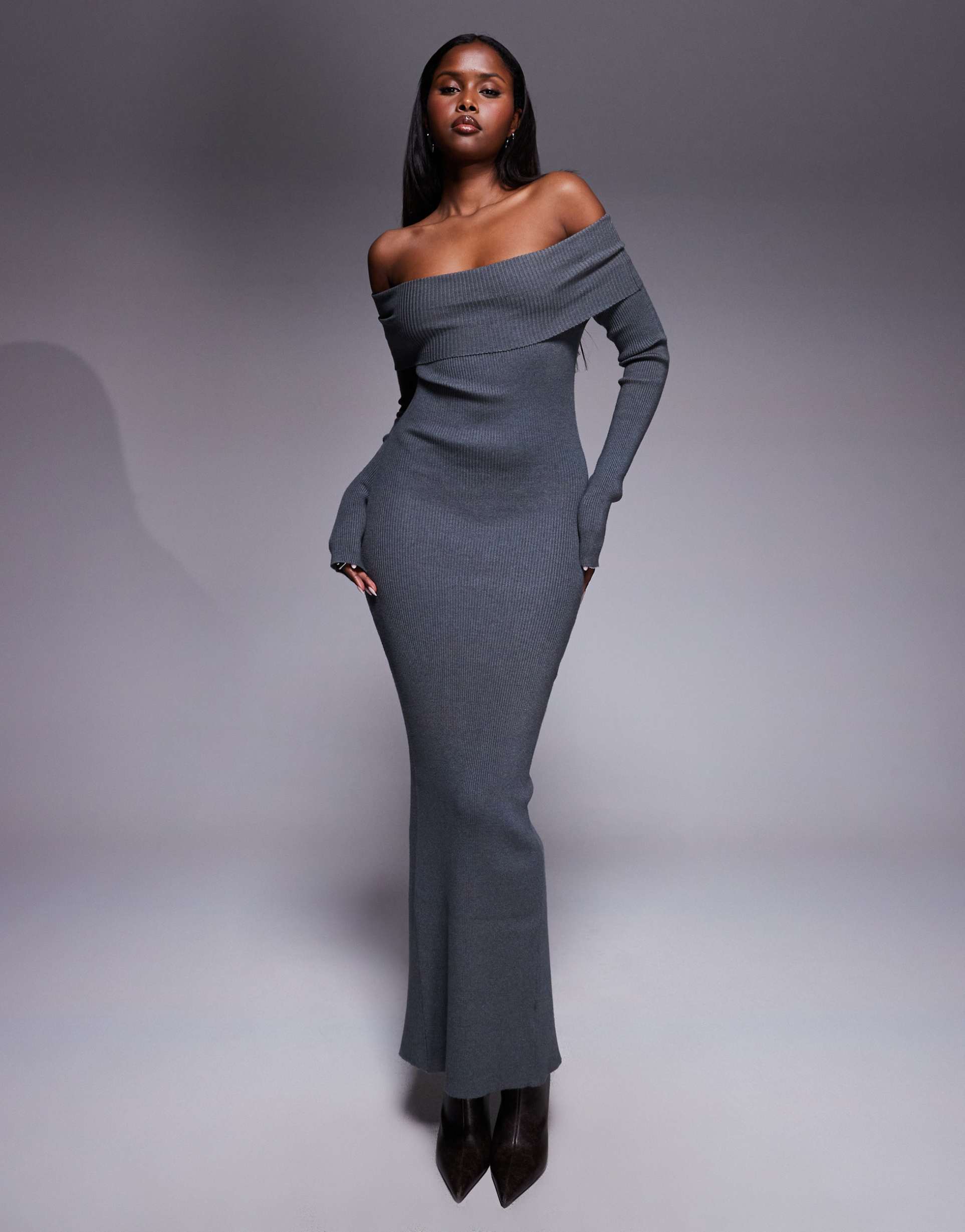 Feel the allure of midnight ease with this charcoal off-shoulder ribbed maxi. The fold-over panel creates a soft, draped Bardot neckline while long, slim sleeves stream into a figure-skimming column silhouette. Crafted in soft, stretchy ribbed jersey from viscose, polyester and elastane, it moves with you yet holds a refined shape. A subtle back slit adds movement and edge to the sleek look. Pullover and versatile, it elevates day-to-night styling—pair with heels for a date night or add a blazer for chic, all-occasion wear.