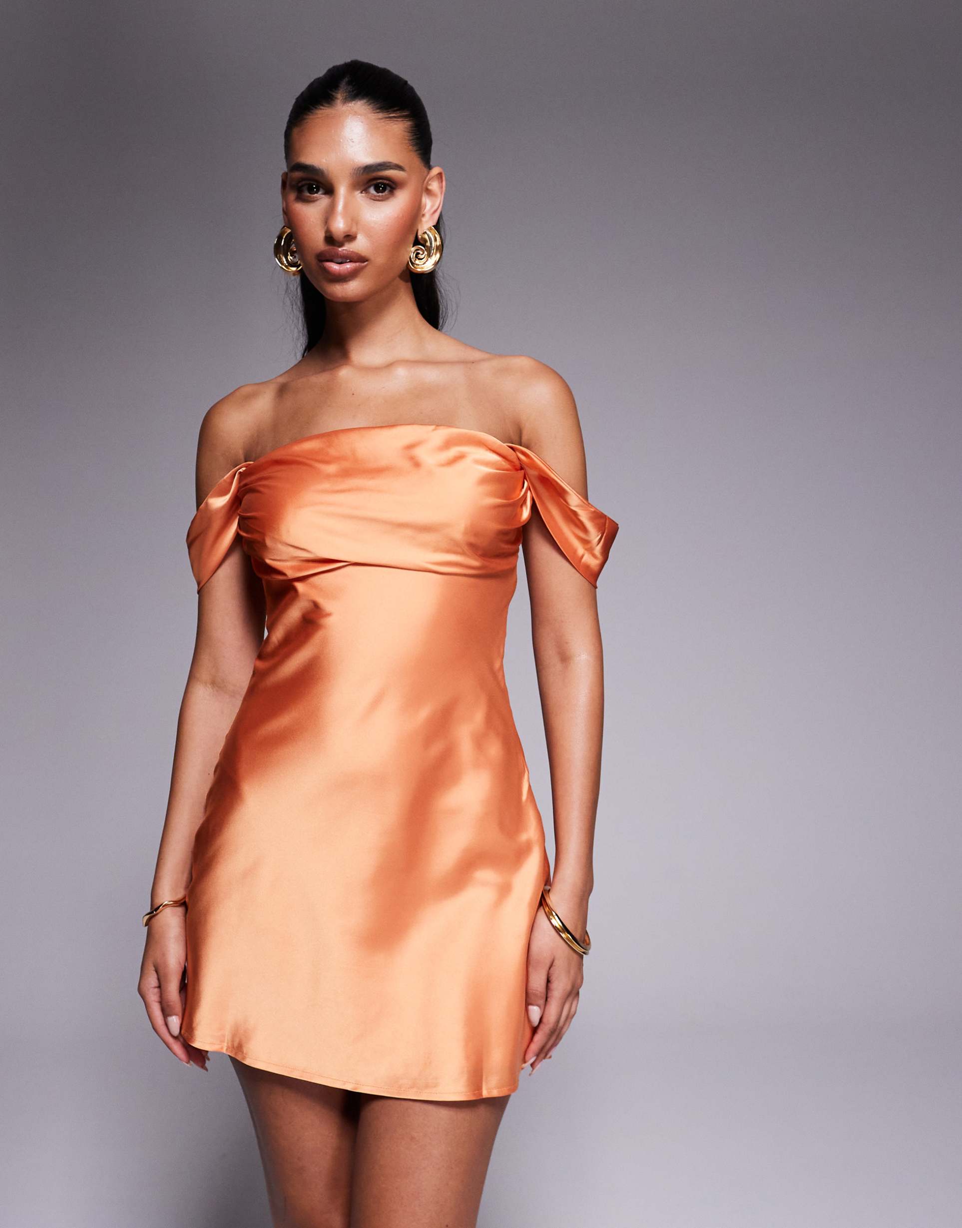 PRINCESS POLLY ZABBARRA SATIN OFF THE SHOULDER DRAPE DETAIL MINI DRESS IN ORANGE