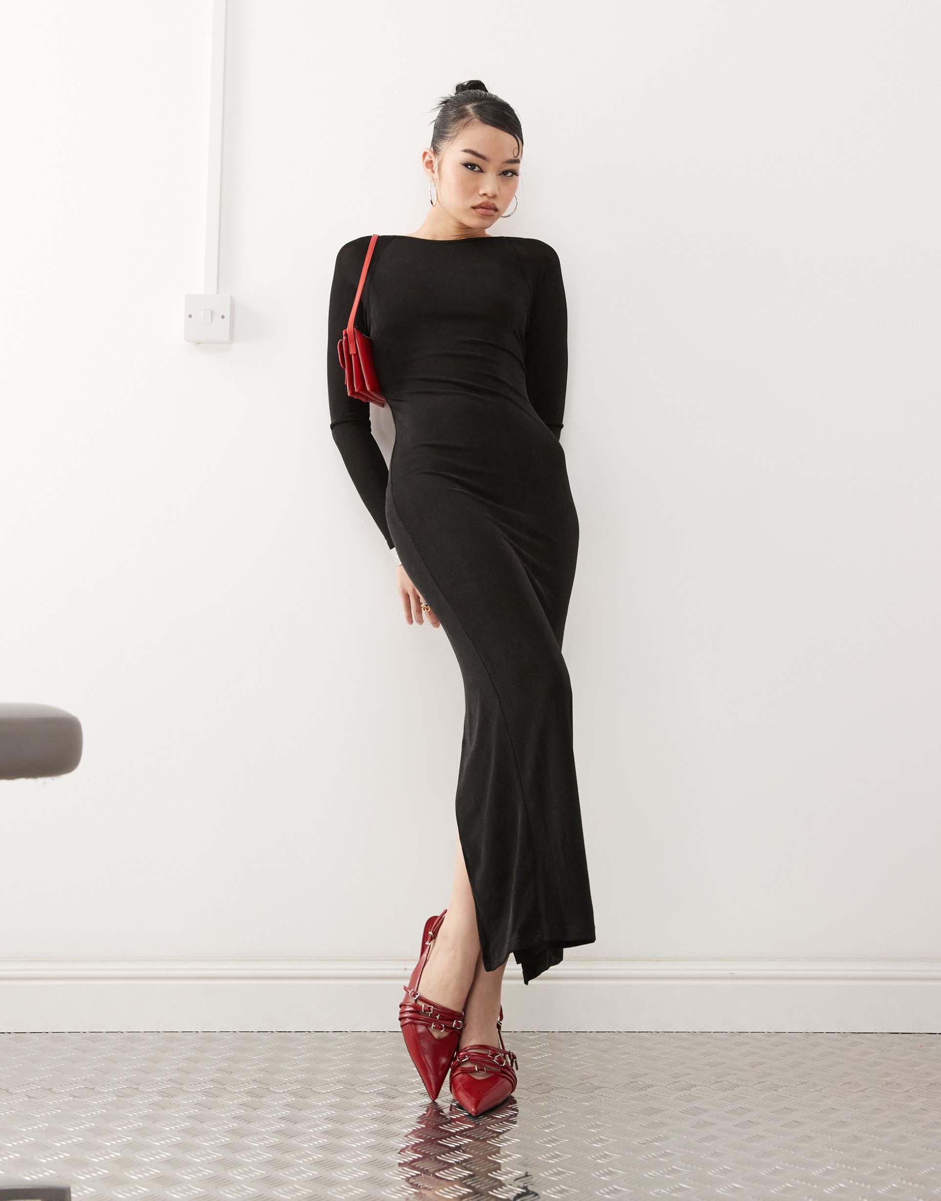 PRINCESS POLLY SLINKY BOATNECK LONG SLEEVE BACKLESS MAXI DRESS IN BLACK