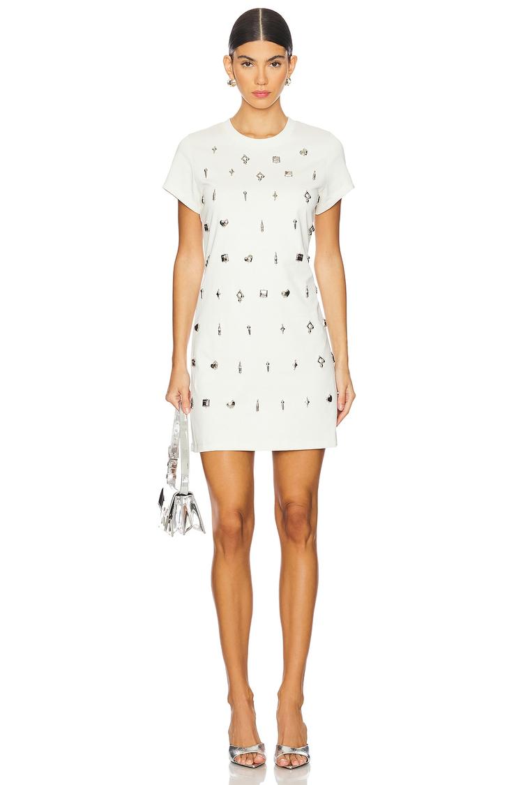 Soft midweight cotton jersey forms a regular fit T-shirt dress in a clean matte off-white hue, accented with metallic silver pin embellishments across the front for a subtle edge. The mini length and half sleeves with a classic crew neck create a versatile, minimalist silhouette ideal for casual outings, brunches, or relaxed date nights. Slip-on styling enhances comfort while the covered back maintains simplicity. This dress offers effortless style with a touch of charm, perfect for spring through autumn wear and easy to pair with your favorite accessories and shoes.