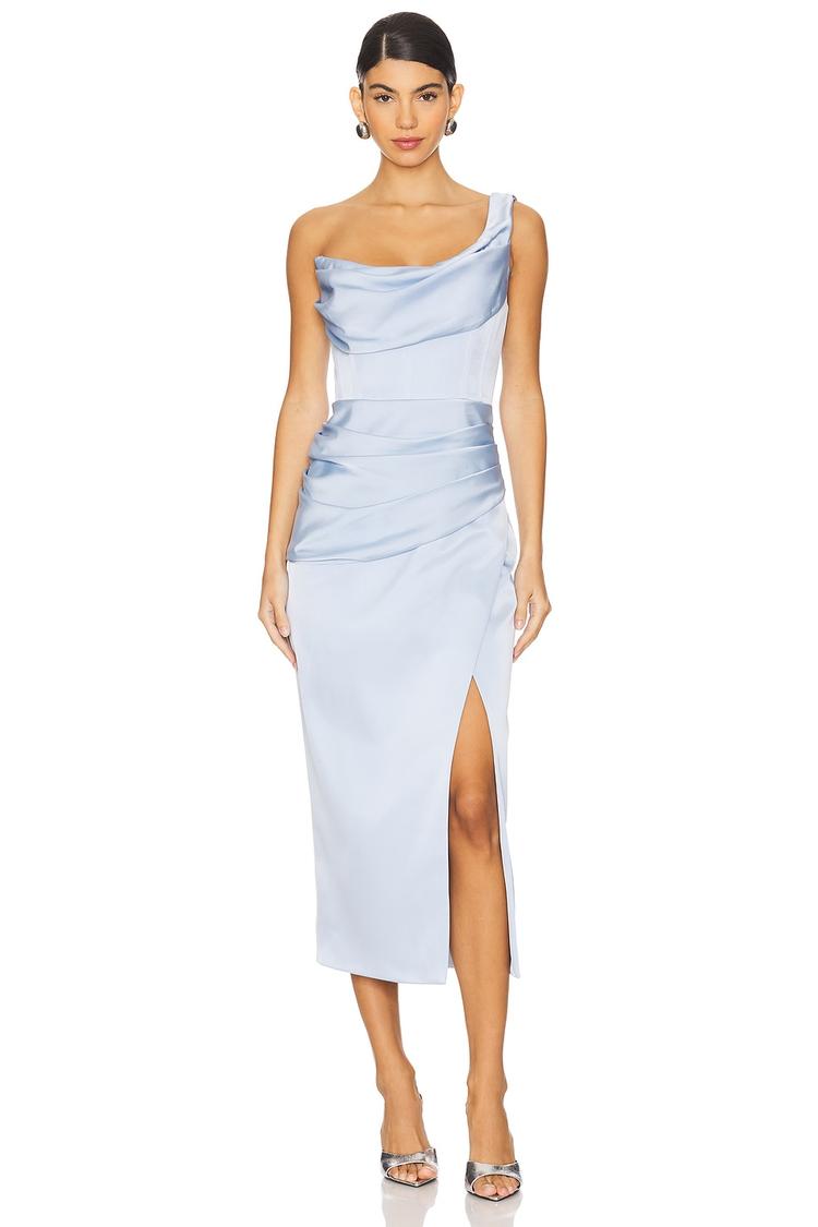 Soft matte light blue crepe fabric shapes a fitted sheath silhouette with elegant cowl neckline and sleeveless strapless styling. This midi dress features delicate draping on the front and a tasteful side slit that adds movement and allure. A concealed back zipper and boned bodice ensure a structured, flattering fit. Ideal for cocktail parties, date nights, and evening outings, its sophisticated design and midweight fabric make it perfect for spring and summer events.