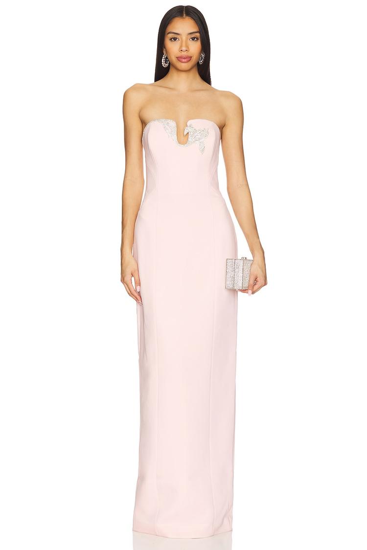 Matte blush crepe fabric and a figure-hugging column silhouette define this elegant gown with a structured, boned bodice. The strapless sweetheart neckline is elevated by a sparkling rhinestone trim, adding a sophisticated touch to the clean maxi hem. Designed for a fitted look with an invisible back zipper, this versatile gown suits formal events, cocktail parties, and black tie occasions with ease. Its heavyweight crepe fabric ensures a smooth drape and all-weather wearability, making it a timeless addition to your special occasion wardrobe.