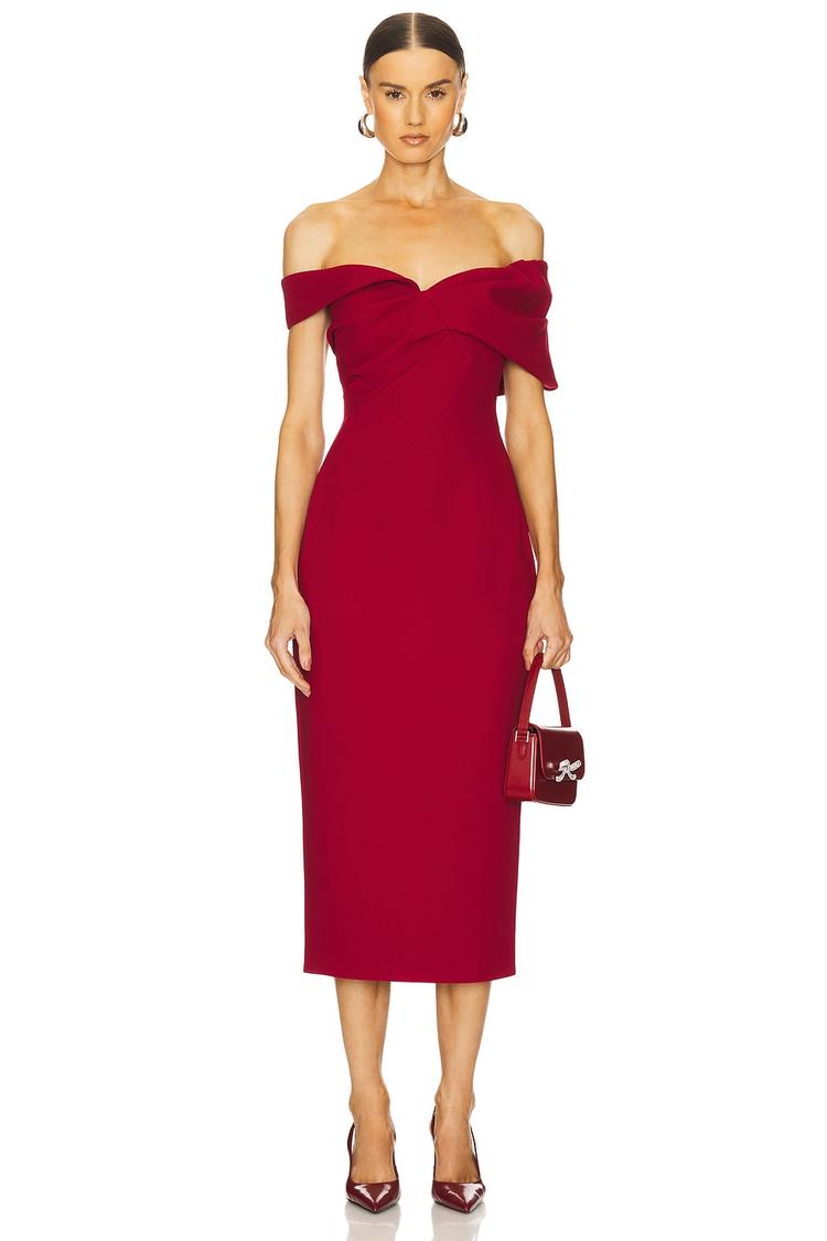 A refined silhouette with a fitted sheath cut and a midi length, this matte wine crepe dress features a structured boned bodice and an elegant straight off-shoulder neckline. The heavyweight fabric and hidden back zipper ensure a sleek fit, complemented by a back vent for ease of movement. Fully lined for comfort, this sophisticated dress suits cocktail parties, formal events, and romantic date nights with its classic and elegant style.