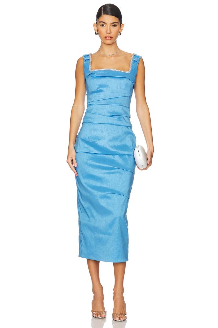 A sleek blue sheath dress with a fitted silhouette and midi length creates a refined look perfect for cocktail evenings or semi-formal occasions. The square neckline is adorned with sparkling crystal trim, adding a touch of glamour to the sleeveless, wide strap design. Crafted from a smooth blend of polyester, nylon, and elastane, this lined dress offers comfort and stretch. A hidden back zipper and back slit detail enhance ease of wear and movement. Ideal for date nights and sophisticated events, this dress combines elegance with modern style.