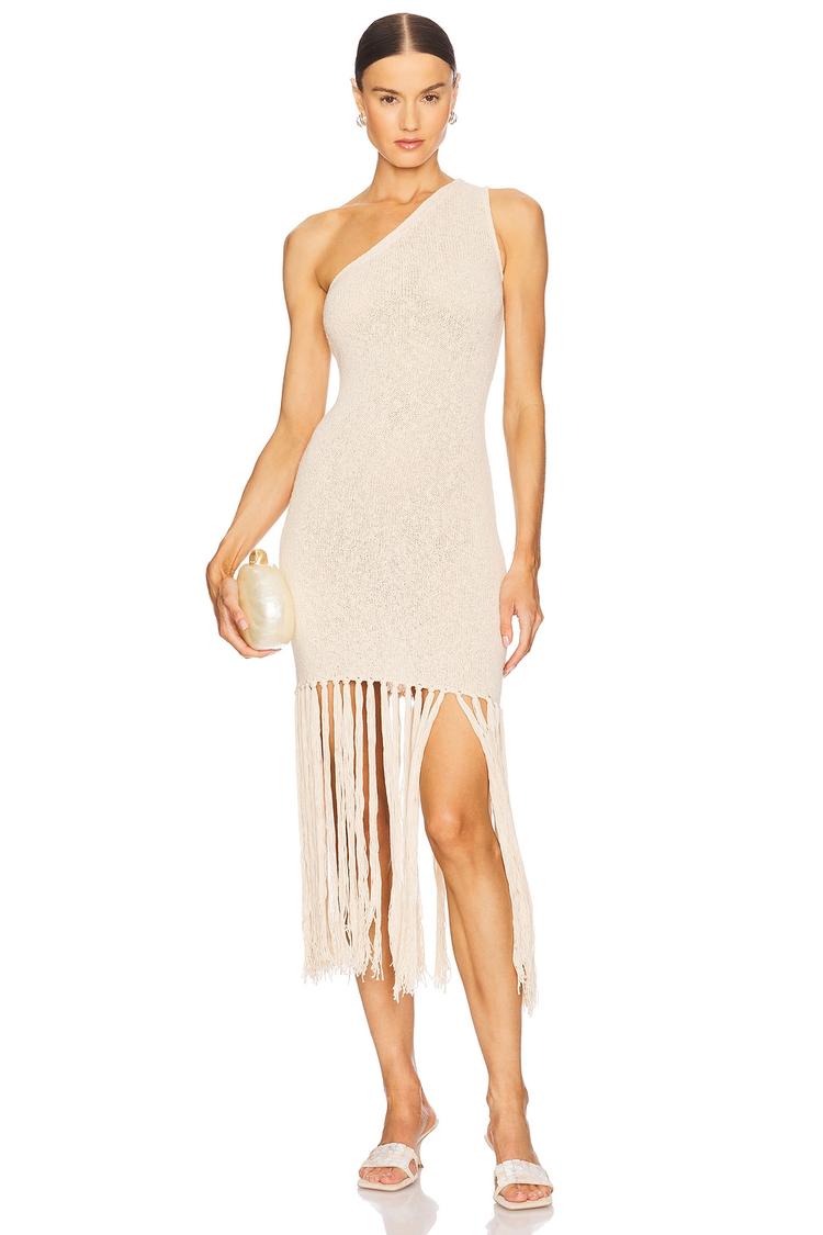 Soft cream knit fabric and an asymmetric neckline combine effortlessly in this shift dress, designed for a relaxed yet chic vibe. The sleeveless silhouette and mid-length fringed hem add a playful bohemian touch, perfect for spring and summer days. Easy to slip on and comfortable to wear, this dress transitions beautifully from casual brunches to stylish date nights, embracing casual chic style with a modern twist.