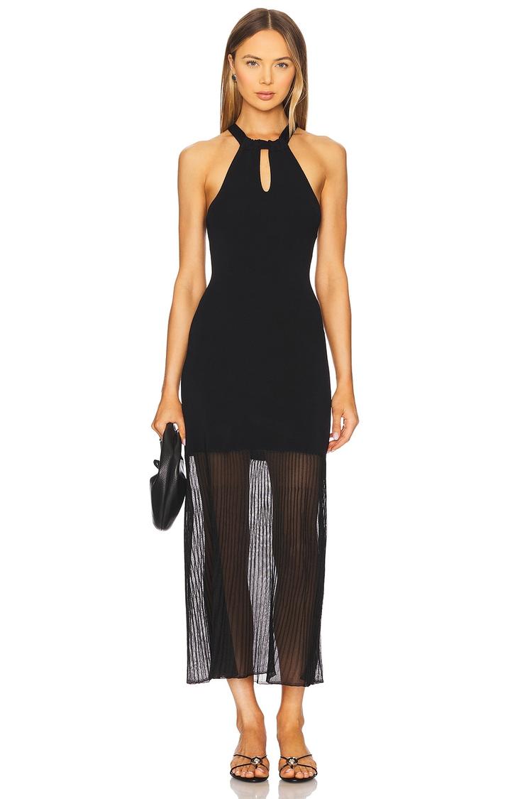 A sleek black sheath silhouette with a halter neck and front keyhole detail creates a striking look for evening occasions. The bodycon fit sculpts the figure while the sheer midi-length panels add an alluring touch of texture and movement. Crafted from a midweight stretchy jersey blend of viscose, nylon, polyester, and elastane, this dress offers both comfort and style. Ideal for cocktail parties, date nights, and nights out, its minimalist design pairs effortlessly with heels and accessories for sophisticated allure.