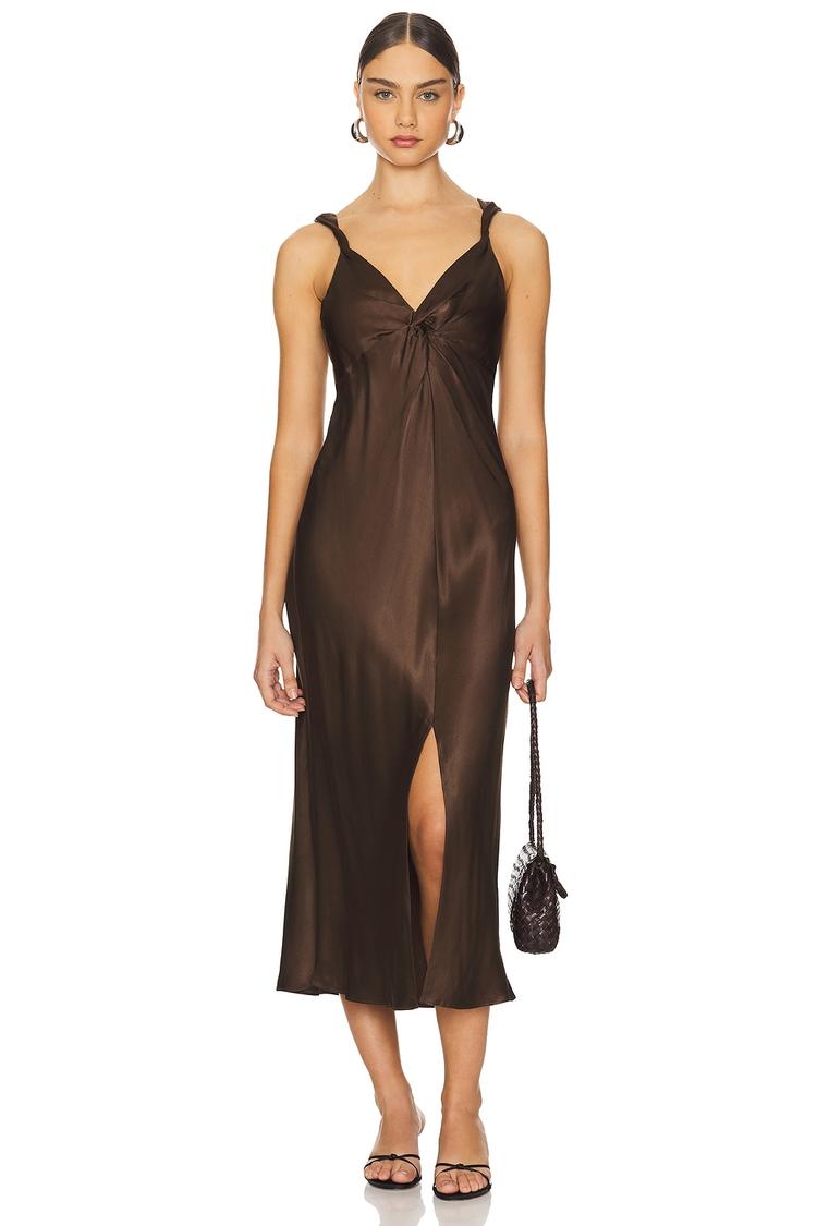 Sleek matte brown satin fabric defines this slim-fitting slip dress, featuring a flattering V-neckline front and back. The midi length and front slit add a subtle touch of allure, while spaghetti straps keep the silhouette light and modern. Designed for pull-on ease, this versatile dress suits spring through autumn occasions, from elegant date nights to stylish cocktail events and vibrant nights out. Its minimalist yet sexy style embodies contemporary sophistication with an effortless charm.