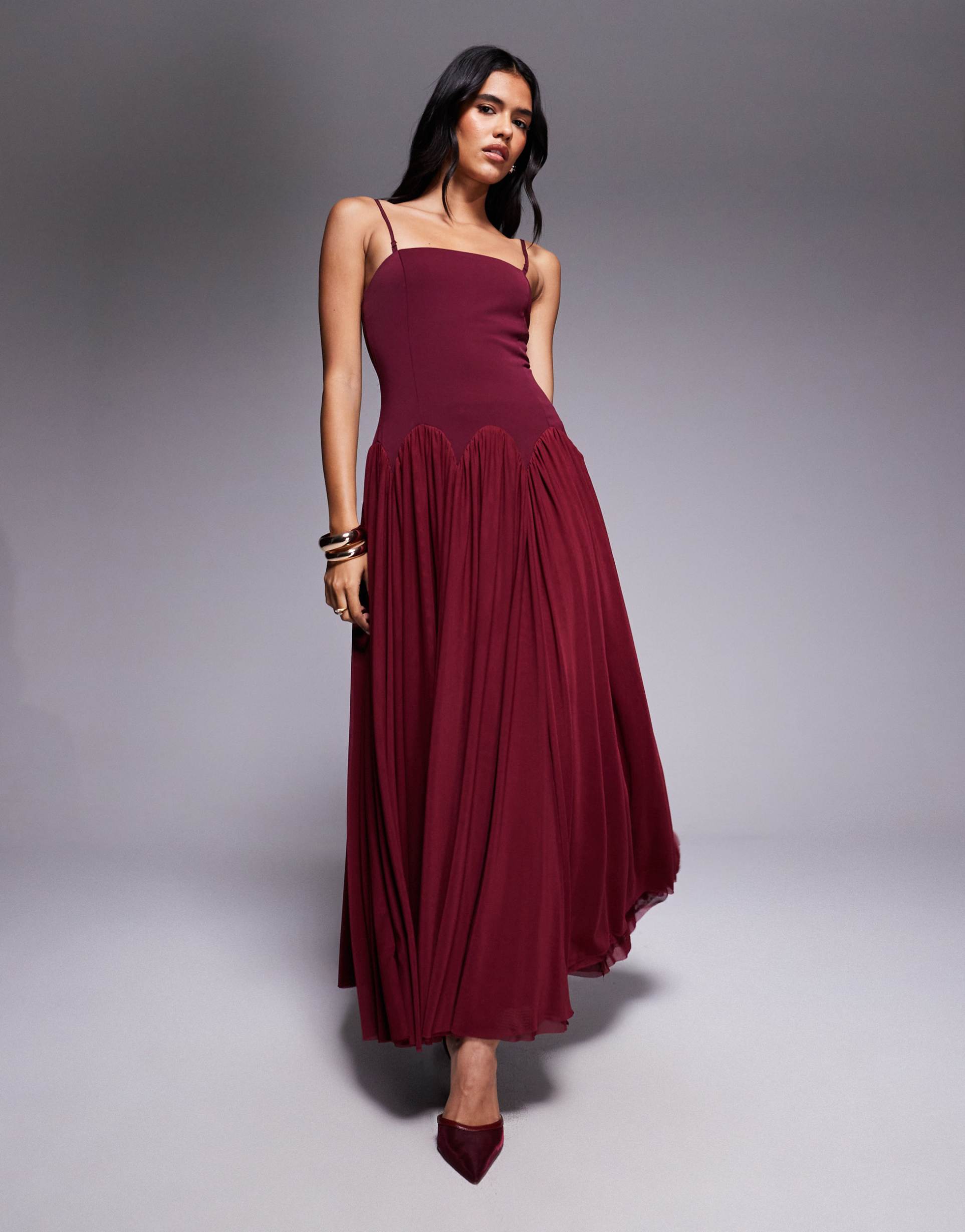 RARE LONDON CAMI SCALLOP DROP WAIST PLEATED MAXI DRESS IN BURGUNDY