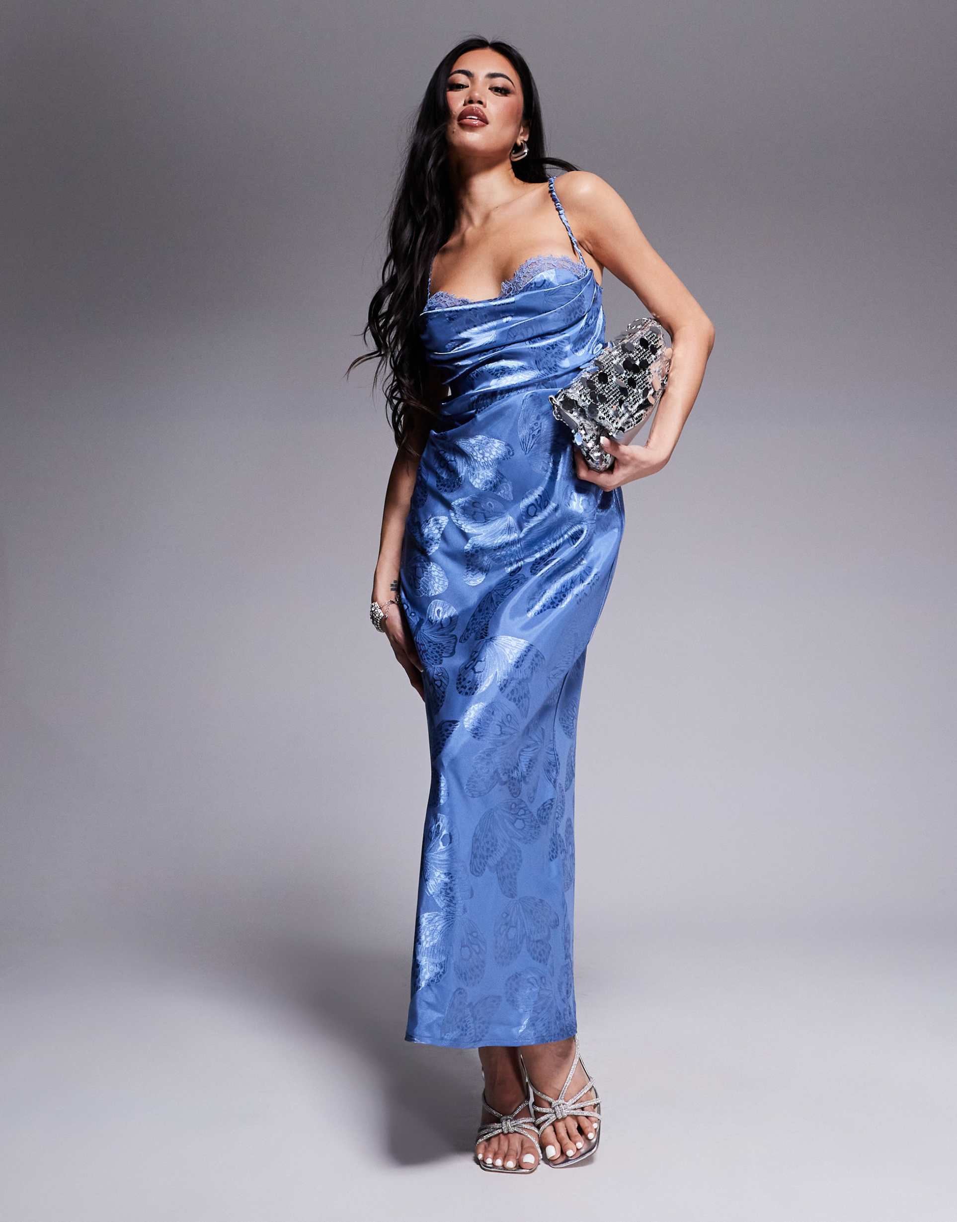 Glossy satin fabric and a figure-skimming maxi silhouette create a captivating look with a sweetheart neckline and delicate lace-trimmed ruching at the bodice. The open back and slender spaghetti straps add a modern, sexy edge to this butterfly print dress, perfect for cocktail parties, date nights, or nights out. This regular fit design combines elegance and comfort with its silky-smooth texture, making it a versatile choice for any season.