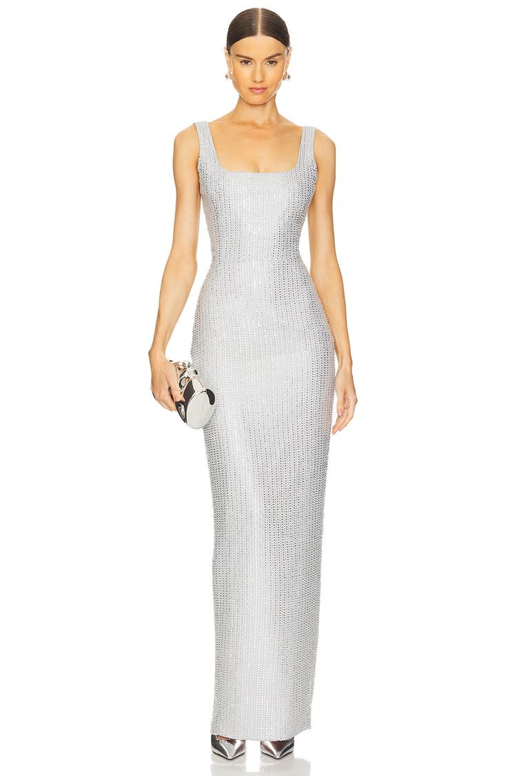 Shimmering with heavyweight rhinestone embellishments, this column maxi dress features a square neckline and wide straps for a sleek, fitted silhouette. The concealed back zipper and back vent enhance comfort and ease of movement, while the fully lined chiffon blend fabric offers a luxurious drape. Ideal for cocktail, semi-formal, and formal occasions, this elegant and sophisticated gown is crafted from a viscose, nylon, polyester, and elastane blend, perfect for all-weather wear. Its silver sparkle adds a striking touch to evening events and special celebrations.