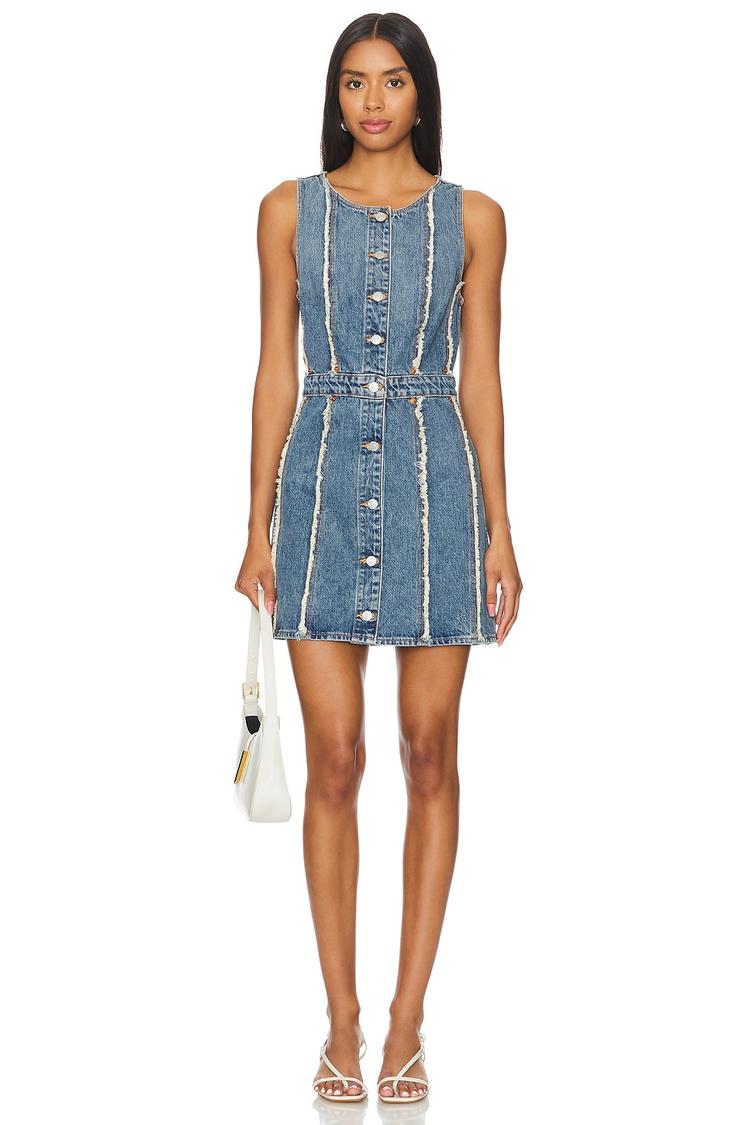 Midweight cotton denim shapes a classic shift silhouette with a mini hemline and sleeveless design. The dress features a round neckline and front button closure, accentuated by white frayed trim running vertically on front and back, adding subtle ruffled detailing. Its regular fit and covered back make it versatile for casual outings, brunch, or laid-back date nights during spring and summer. The matte blue fabric combined with frayed edges brings a timeless, effortlessly chic vibe to your warm-weather wardrobe.