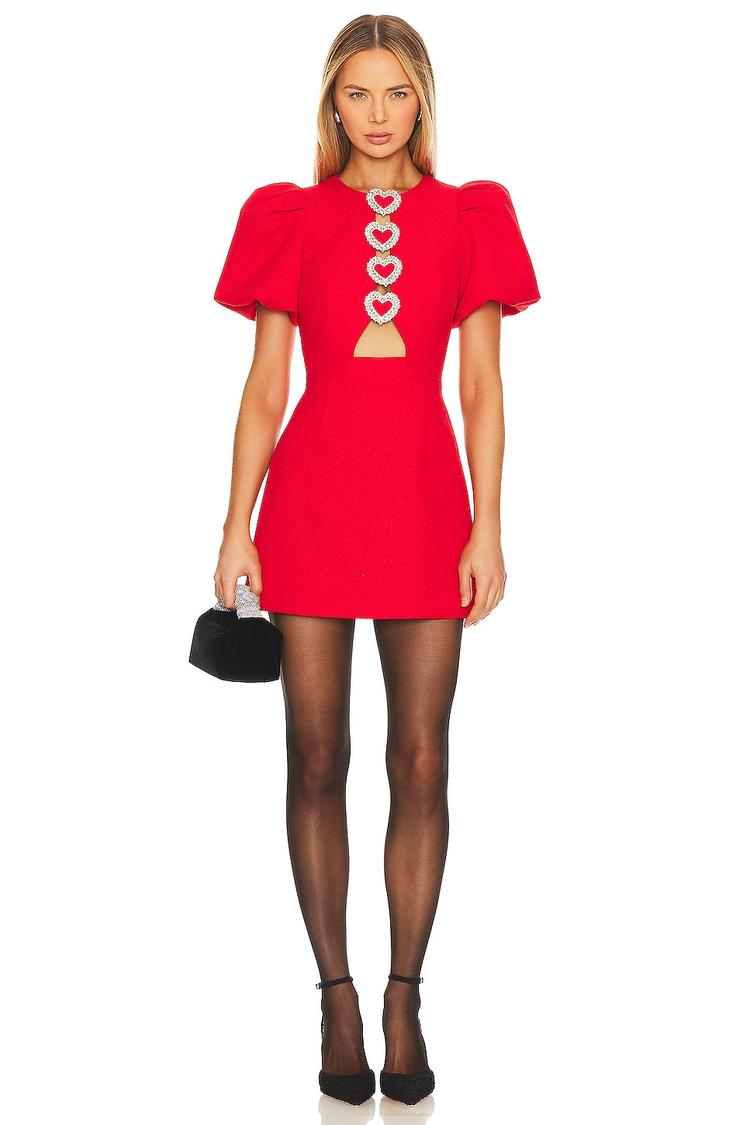 A vibrant red mini dress crafted from textured crepe jersey fabric brings a chic and modern vibe. The fitted silhouette with puffed short sleeves and a round neckline is accentuated by sparkling rhinestone heart embellishments and a striking front cut-out detail. Concealed back zipper ensures a seamless fit. Perfect for cocktail parties, night outs, and romantic dates, this elegant and sexy piece balances bold design with refined tailoring for versatile all-weather wear.