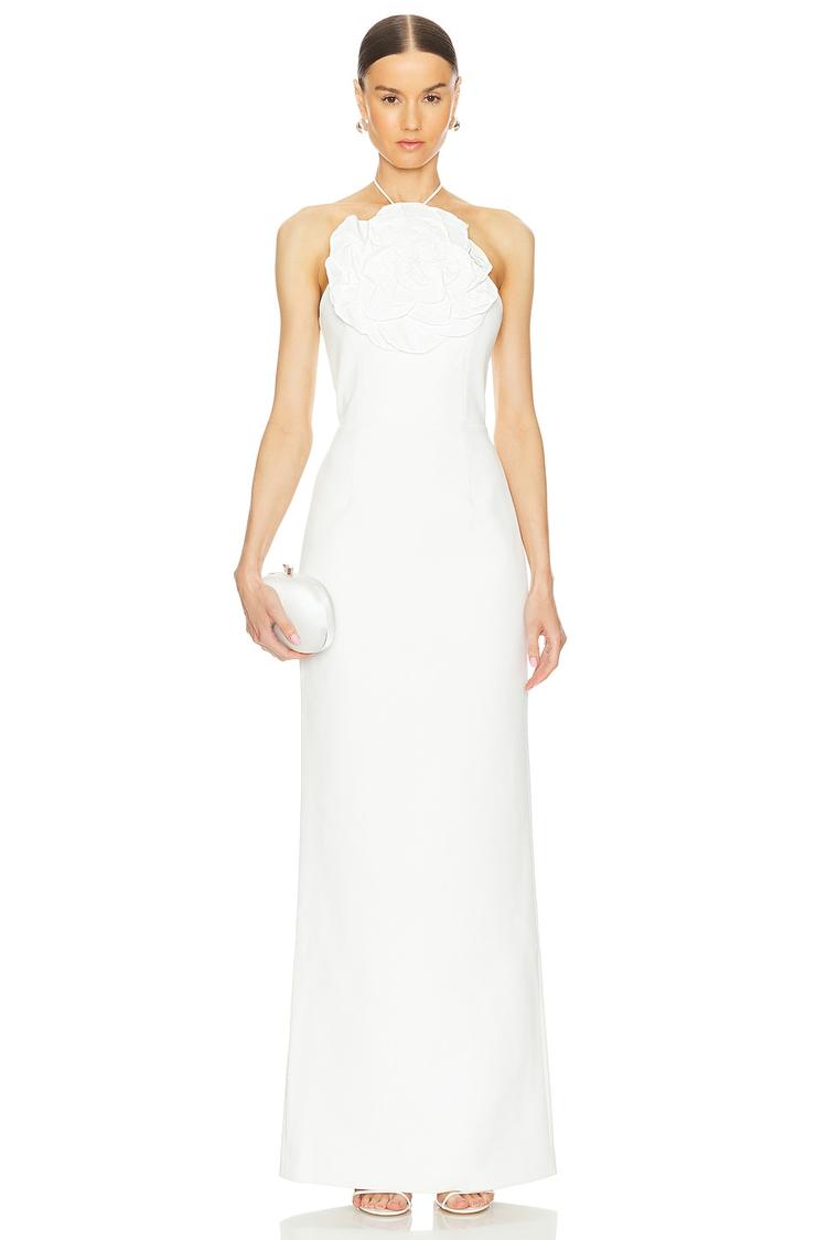 A sleek column silhouette in crisp white polyester and elastane blend creates a timeless look with a fitted, maxi length design. The halter neckline with tie closure and sleeveless style enhance the elegant, sophisticated vibe, while a hidden back zipper and back slit add refined functionality. Delicate 3D floral applique at the bodice provides a standout design detail, perfect for formal occasions, cocktail parties, or wedding guest attire. Fully lined for comfort and a smooth fit, this gown embodies classic elegance for all-weather wear.