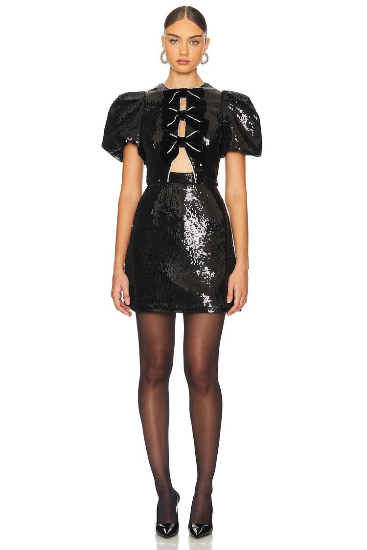 A striking combination of sequin embellishment and velvet bow accents defines this fitted mini shift dress with a round neckline and dramatic puffed sleeves. The open back with an exposed zipper adds an edgy flair, while the clean hemline enhances its sleek silhouette. Crafted from a blend of polyester, elastane, viscose, and silk, this versatile piece shines at cocktail parties, night outs, and other elegant events, effortlessly balancing bold style with refined detailing.