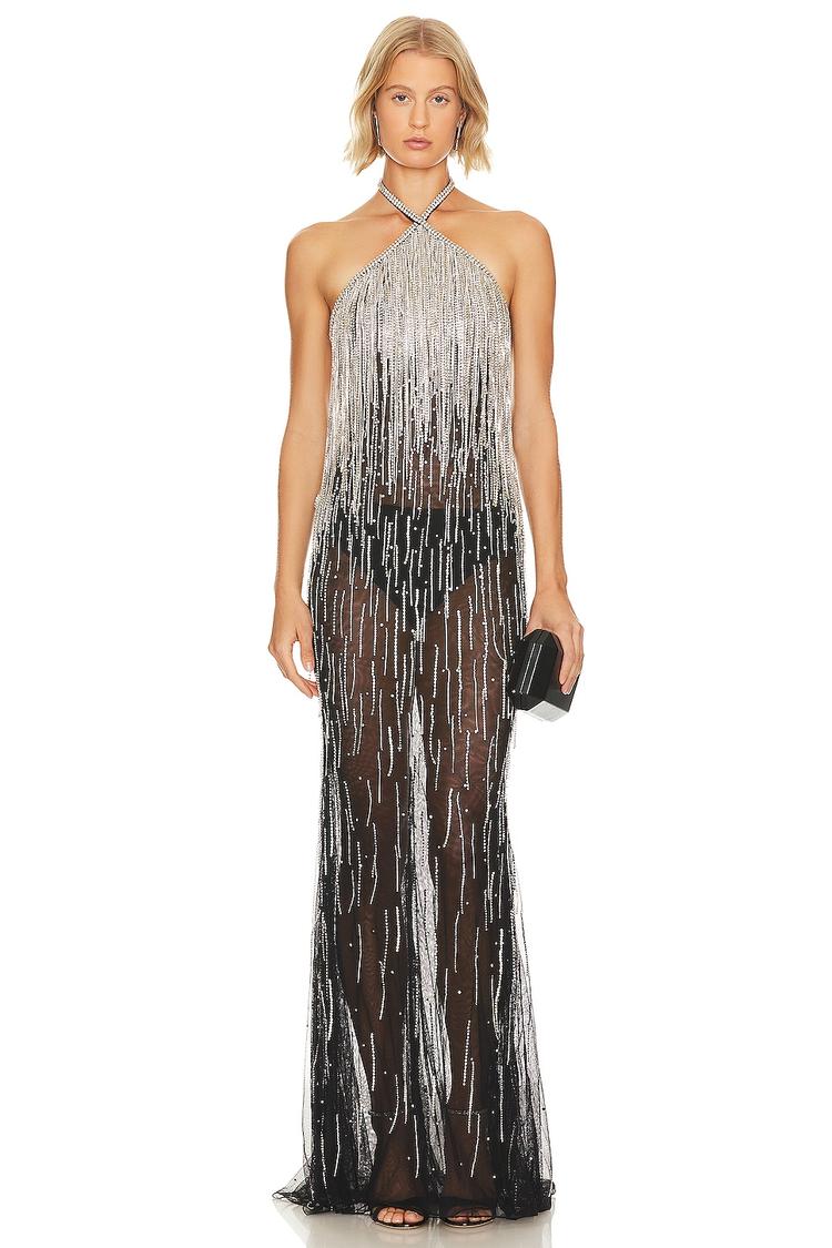 Metallic silver crystals and fringe adorn a sleek column silhouette with a daring open back and halter neckline, creating an elegant and sophisticated evening look. The slim fit and maxi length enhance the modern appeal while the sheer mesh fabric adds a subtle allure. Perfect for cocktail parties, formal events, and night outs, this dress combines shimmering embellishments with a flattering shape to make a standout statement.