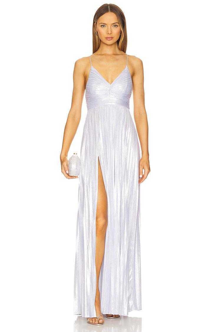 Metallic silver plisse fabric adds shimmering texture to this elegant slip dress, featuring a figure-flattering slim fit and a flowing maxi length. Its V-neckline and delicate spaghetti straps enhance its minimalist modern appeal, complemented by a subtle side slit that adds a touch of allure. Perfect for cocktail parties, formal events, or a sophisticated night out, this dress balances sleek style with graceful movement, making it a versatile and chic addition to your evening wardrobe.