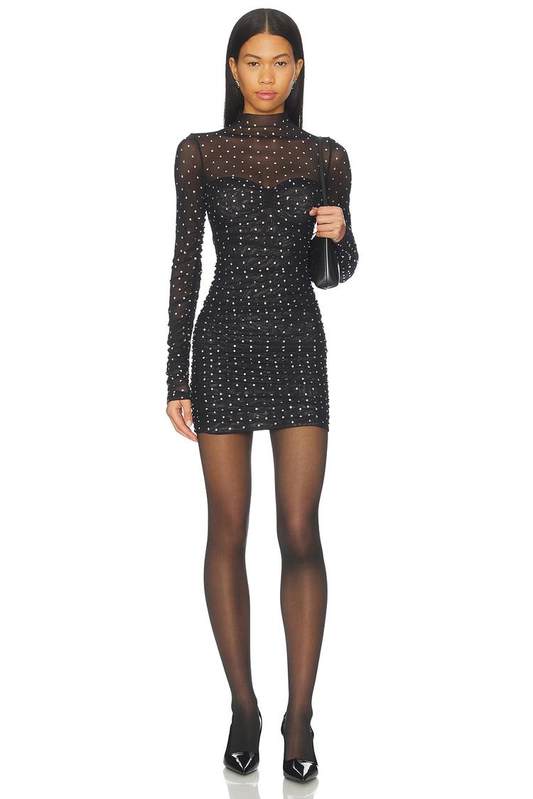 Glamour meets edge in this fitted mini dress featuring a sleek mock neck and long sleeves crafted from midweight black mesh fabric. The bodycon silhouette is enhanced by ruched sides that flatter the figure, while silver rhinestone embellishments sparkle all over for a dazzling effect. Fully lined for comfort, this slip-on dress is perfect for cocktail parties, night outs, or intimate date nights, offering a chic and trendy look that shines under evening lights.