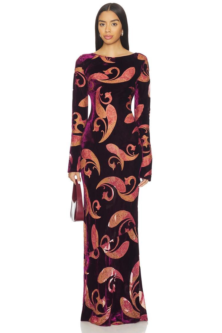 Luxurious velvet in a rich black base with swirling dusty rose and burgundy abstract patterns defines this slim-fit column maxi dress. Featuring long sleeves and a classic round neckline, it balances elegance with retro flair. The striking tie-back detail adds an alluring twist, perfect for cocktail parties, date nights, or sophisticated evening outings. Crafted from a rayon and nylon blend, the dress offers comfortable stretch and a sleek silhouette for cooler autumn and winter occasions.