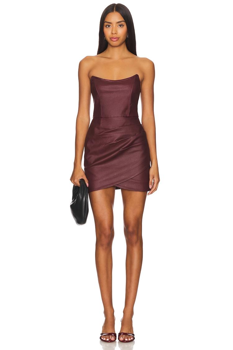 A sleek matte burgundy corset dress features a straight, strapless neckline and a fitted silhouette that hugs the body. The mini length and clean hemline emphasize modern, sexy styling perfect for night outs, cocktail events, or date nights. Constructed from a blend of rayon, nylon, spandex, and polyester, this fully lined dress offers both stretch and structure. A discreet back zipper closure adds a smooth finish, making it a chic and versatile option for all seasons.