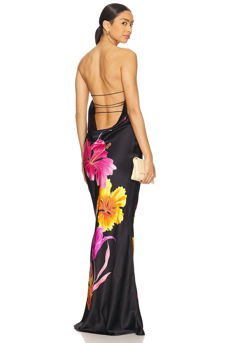 Soft satin silk and a figure-hugging silhouette create an elegant slip dress with a straight neckline and strapless design. The maxi length and slim fit enhance its sophisticated appeal, while the vibrant all-over floral print adds a splash of bright pink and yellow hues. Draped fabric detailing and delicate tie-back straps at the back add a graceful finishing touch. Ideal for cocktail parties, date nights, and formal events during spring and summer, this dress balances timeless elegance with standout design details for versatile evening wear.