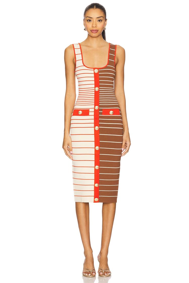 Bold color-blocked stripes in rich browns and beige define the sleek sheath silhouette of this midi dress, enhanced by vibrant red decorative buttons and faux welt pockets on the front. Crafted from a midweight knit fabric blend of rayon, nylon, and spandex, it offers a comfortable fitted shape with wide straps and a flattering U-neckline. The back zipper closure ensures a smooth fit. Ideal for casual brunches, business casual days, or date nights, this dress blends retro charm with sophisticated style for versatile seasonal wear.