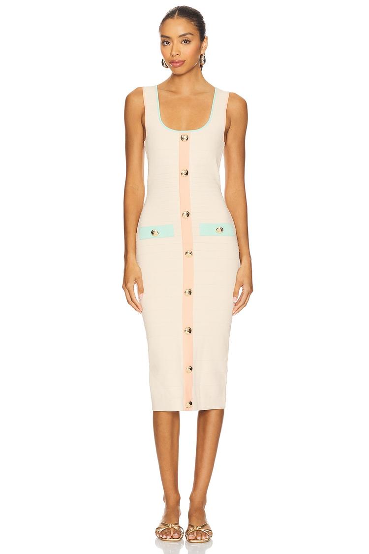 Soft cream hues paired with mint accents bring a fresh retro vibe to this fitted midi sheath dress. Crafted from a midweight knit blend of rayon, nylon, and spandex, it offers stretch and comfort with a sleek silhouette. The sleeveless design features wide straps and a flattering U-neckline, while decorative mint bows and faux front pockets add charming details. A back zip closure ensures a smooth fit. Ideal for casual days, brunch outings, or date nights, this versatile dress blends classic style with modern comfort effortlessly.