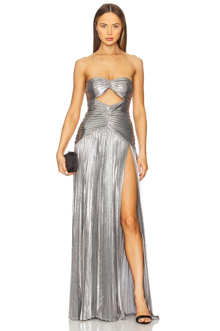 Shimmering metallic silver plissé fabric brings a modern elegance to this column silhouette maxi dress. Featuring a fitted bodice with a straight, strapless neckline and seductive cut-out front detail, it delivers a striking look. The exposed side zipper and thigh-high slit enhance the sleek and sexy appeal. Perfect for cocktail parties, formal events, or night outs, this dress combines contemporary style with effortless glamour.