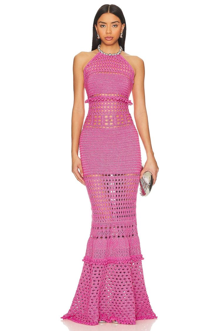 Soft shimmer bright pink crochet fabric with metallic threading crafts a fitted column silhouette that flows gracefully to a ruffled maxi hem. The halter neckline adorned with silver-tone beads complements the open back and sleeveless cut, creating an elegant and sophisticated vibe. Perfect for spring and summer cocktail parties, date nights, or upscale evenings out, this midweight dress combines comfort with standout style. The hand-washable cotton-polyester blend ensures ease of care while making a statement in any refined setting.