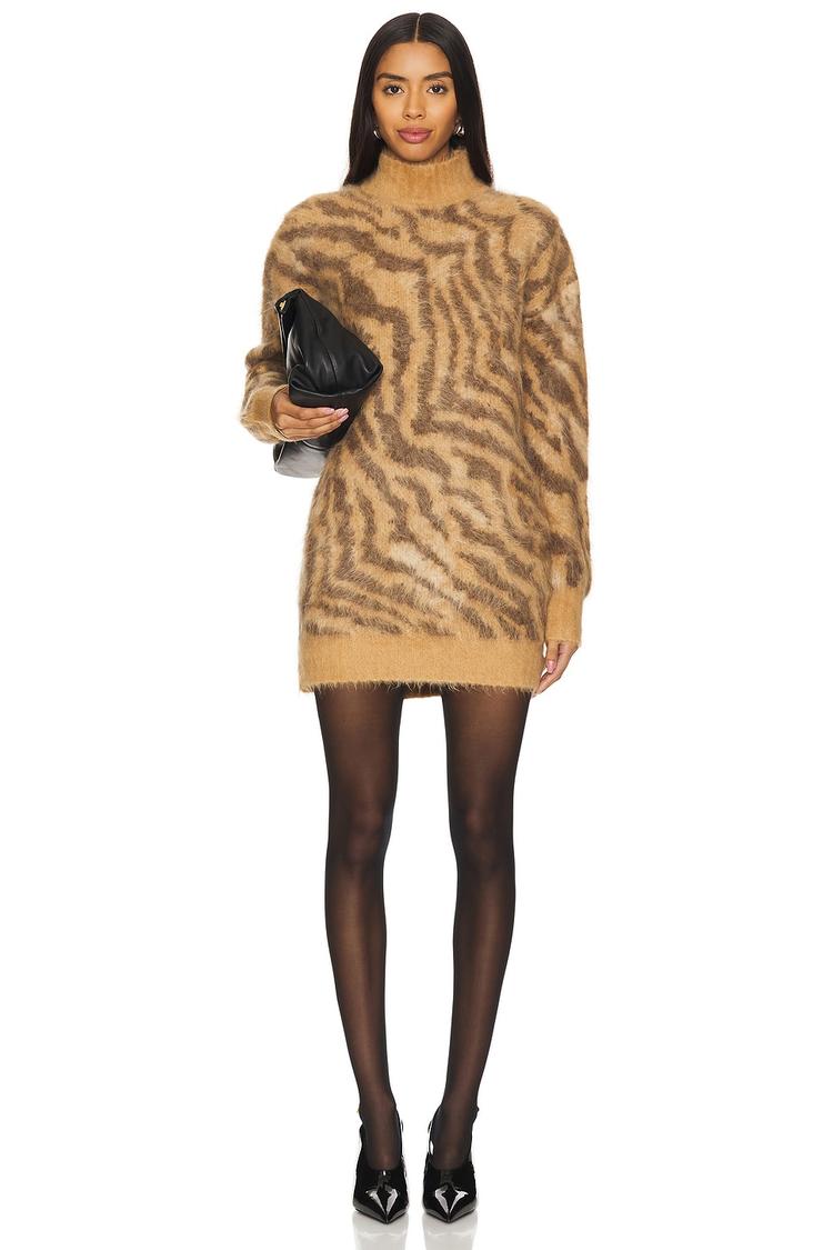 Soft alpaca knit with a cozy turtle neck and relaxed silhouette defines this mini sweater dress. Its abstract brown and beige pattern adds a warm, casual chic vibe perfect for autumn and winter days. The ribbed trims on the cuffs, hem, and collar give subtle texture contrast, while the long sleeves and pull-on slip styling ensure comfort and ease. Ideal for casual outings, brunch dates, or laid-back evenings, this midweight knit dress blends warmth with minimalist style effortlessly.