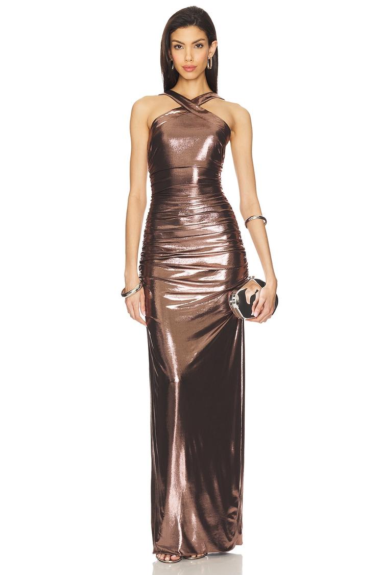Metallic bronze lame fabric and a sleek sheath silhouette combine to create a striking maxi dress with a fitted shape. The straight neckline and spaghetti straps enhance the elegant, modern vibe, while the ruched back adds subtle texture and visual interest. Fully lined for comfort and featuring a hidden back zipper closure, this dress is perfect for cocktail parties, night outs, and date nights. Its heavyweight polyester-spandex blend ensures a smooth fit and flattering stretch, making it a standout piece for evening occasions.