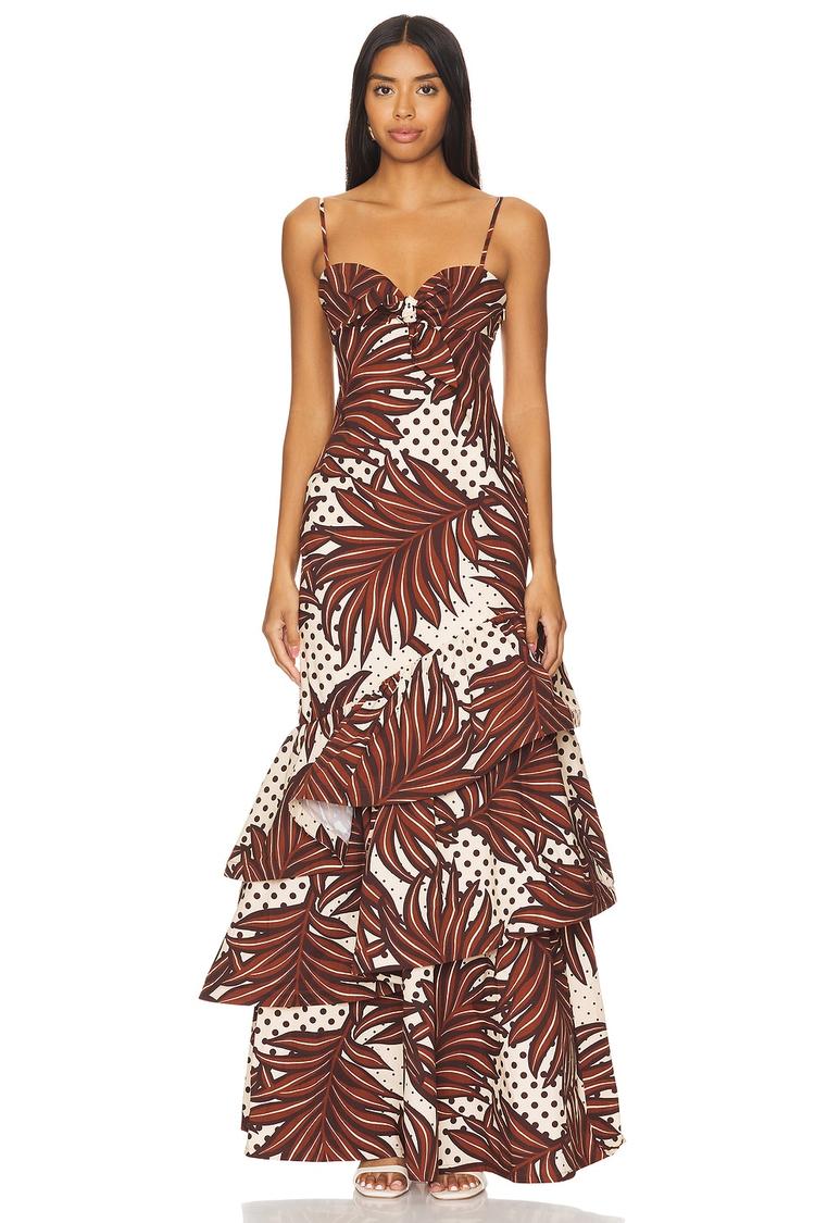 A captivating fit and flare silhouette in soft crepe cotton blends comfort with style. The maxi length features a tiered skirt that adds elegant volume and movement, while the sweetheart neckline and open back with elastic strap create a flattering, breezy look. Adjustable spaghetti straps enhance the fit for warm spring and summer occasions. The dress is adorned with an all-over floral and polka dot print in matte brown and white, making it ideal for cocktail parties, date nights, and wedding guest appearances. A side zipper closure ensures ease of wear and a polished finish.