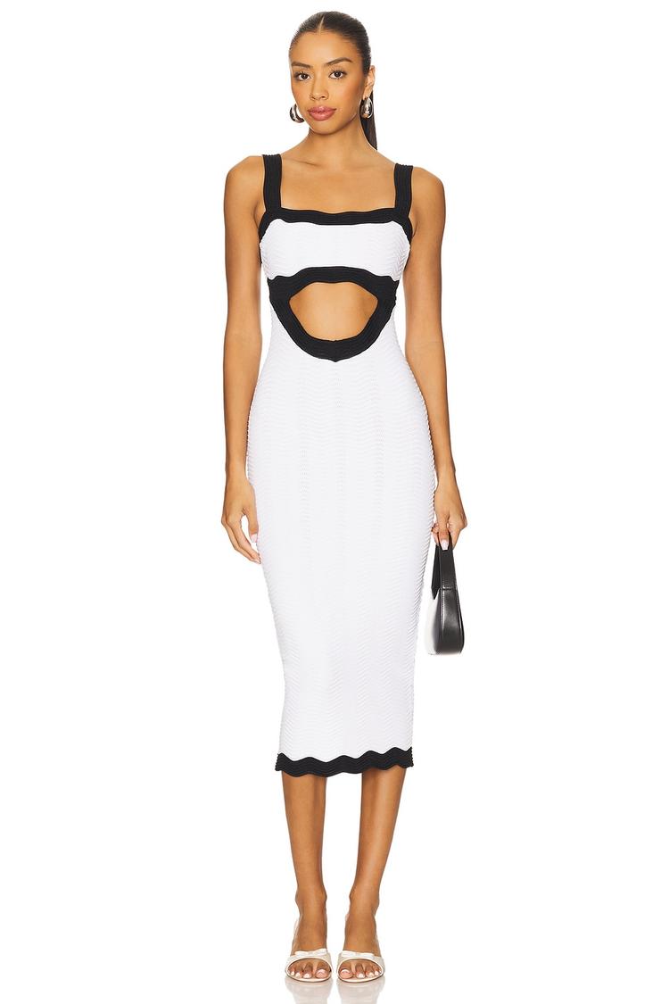 A striking midi sheath silhouette in midweight ridged ponte fabric delivers a sleek, figure-hugging fit. The white base is sharply defined by black colorblocked trim outlining a bold front cut-out and hem, complemented by wide straps and a square neckline. The back features a clean zip closure for easy wear. This elegant knit dress transitions seamlessly from cocktail parties and date nights to stylish evening events, combining retro charm with modern sophistication and comfortable stretch from rayon, nylon, and spandex fibers.