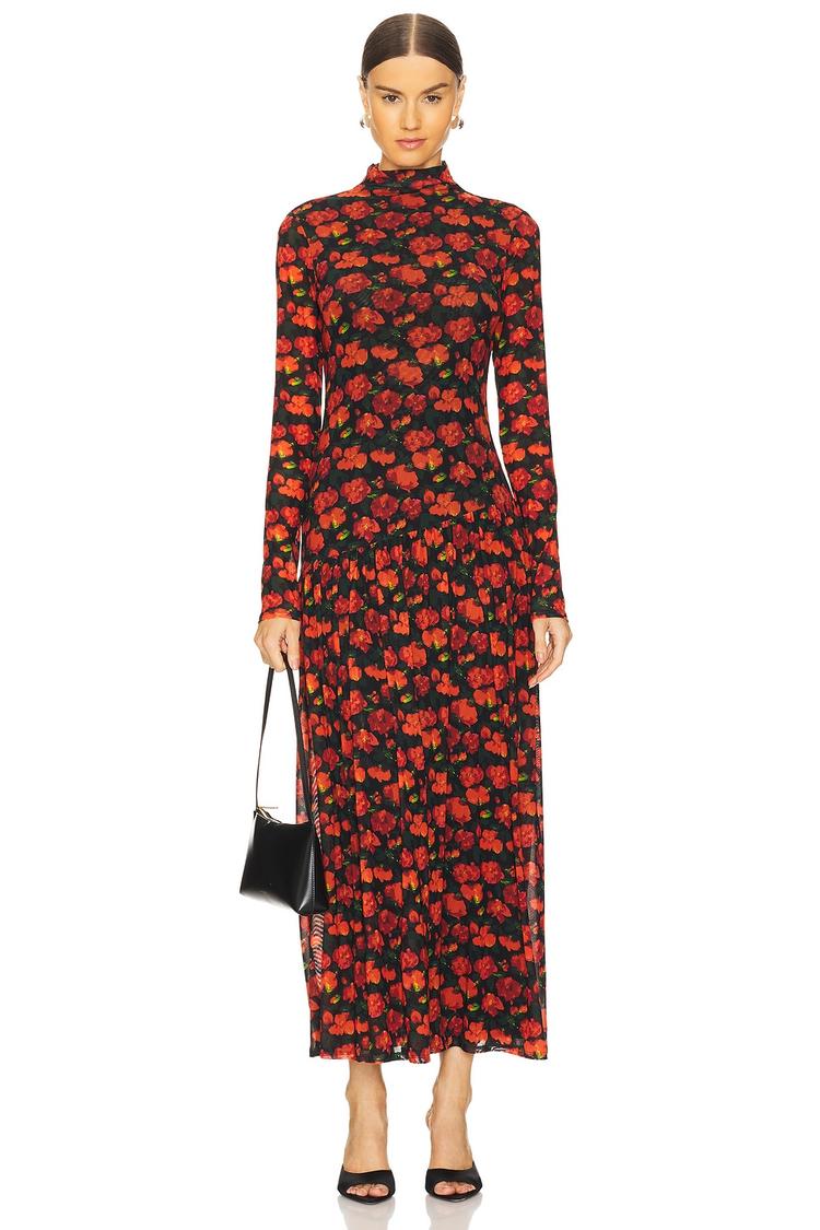 A sleek maxi silhouette with a slim fit and a mock neck brings timeless elegance to this floral mesh dress. The lightweight nylon and spandex blend offer gentle stretch and comfort, while the all-over vibrant red and orange floral pattern adds a striking contrast on the black base. Long sleeves and a covered back create a polished look perfect for cooler seasons. Ideal for cocktail parties, date nights, or stylish evening events, this shift dress combines modern minimalism with versatile sophistication.
