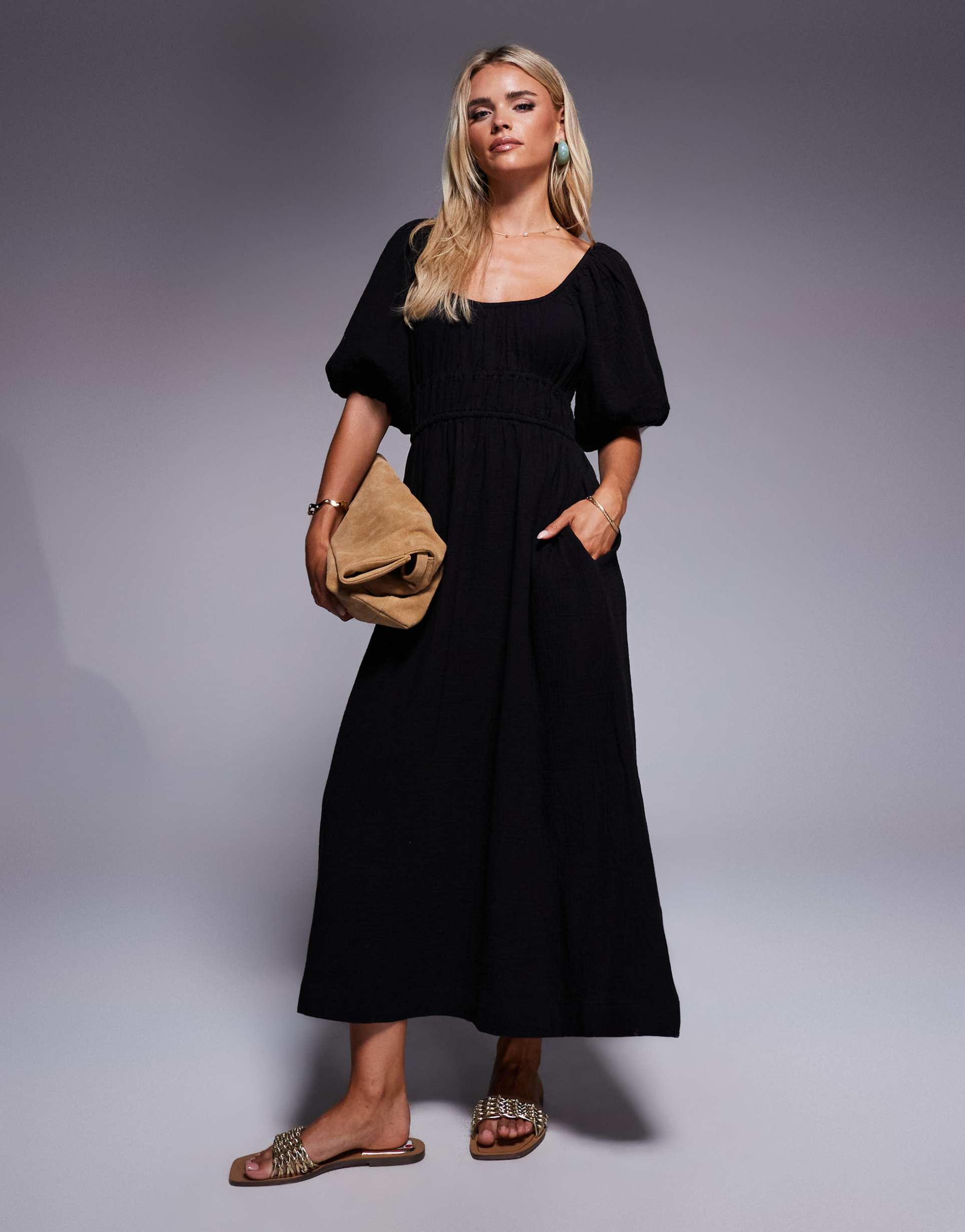 RIVER ISLAND PETITE PUFF SLEEVE LINEN LOOK MIDI DRESS IN BLACK