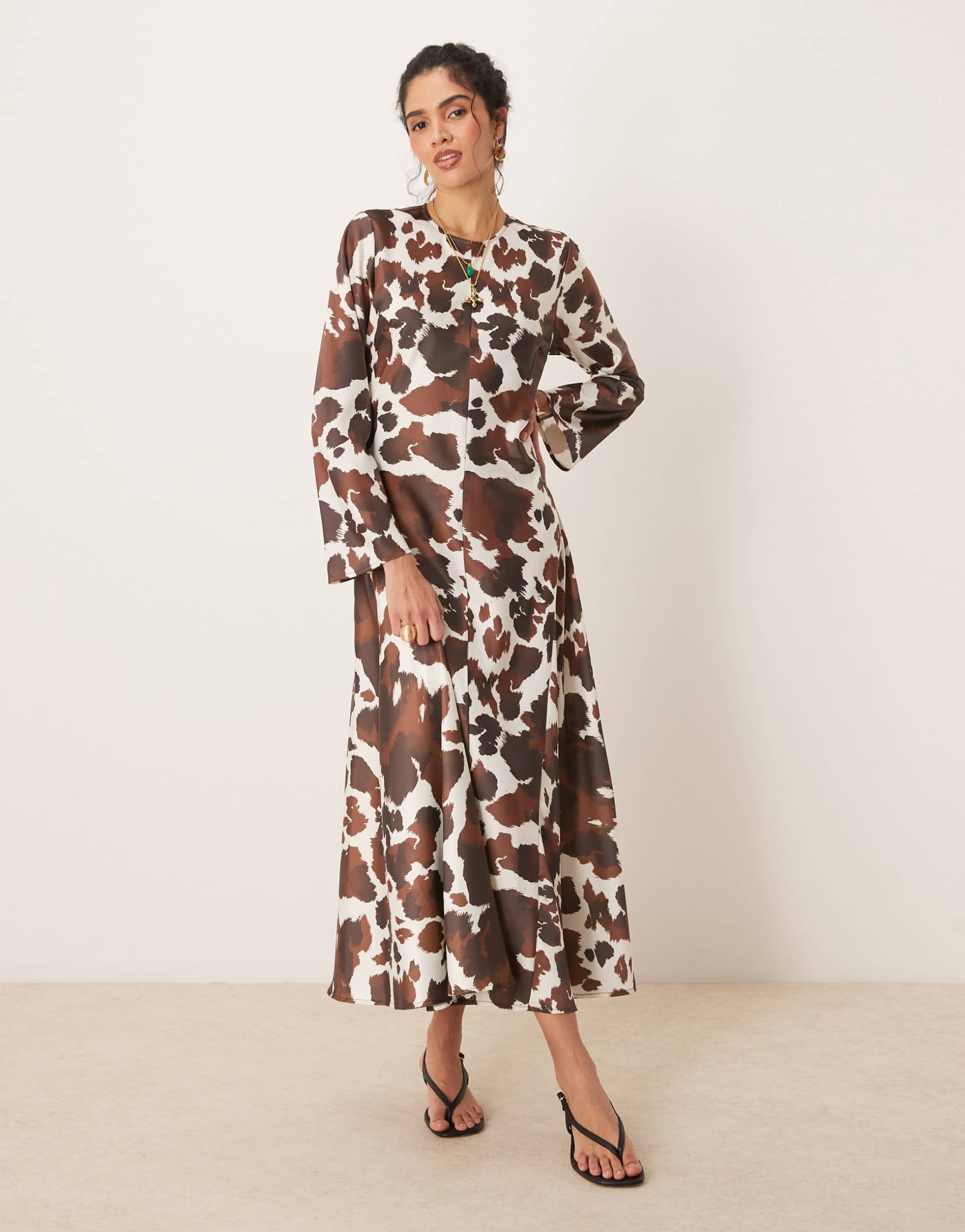 YAS LONG SLEEVE SATIN MAXI DRESS IN BROWN COW PRINT