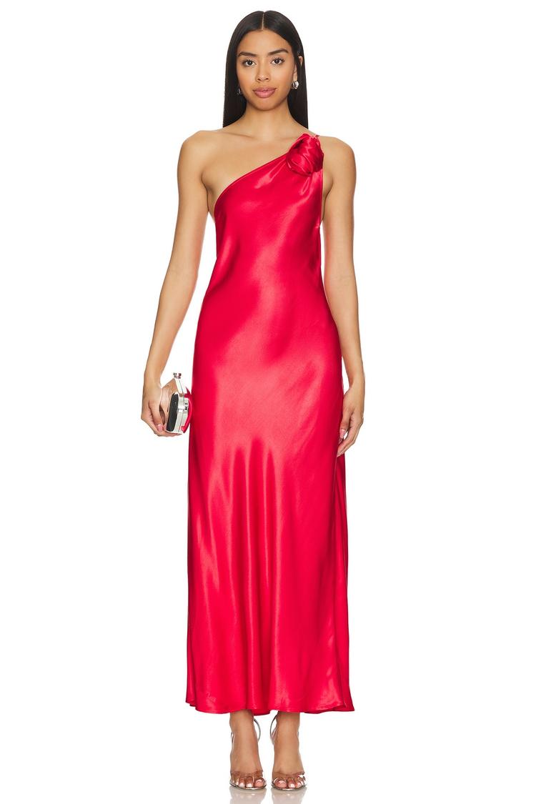 A striking matte red slip dress in flowing viscose satin embodies minimalist elegance with its asymmetric neckline and delicate spaghetti straps. The slim fit gracefully skims the body while a subtle ruffle detail at the front adds a sophisticated touch. Designed in a maxi length, this pullover style dress with a strappy back is perfect for formal evenings, cocktail parties, or romantic date nights. Its smooth satin fabric offers a lustrous sheen ideal for spring and summer occasions, combining comfort and refined style effortlessly.