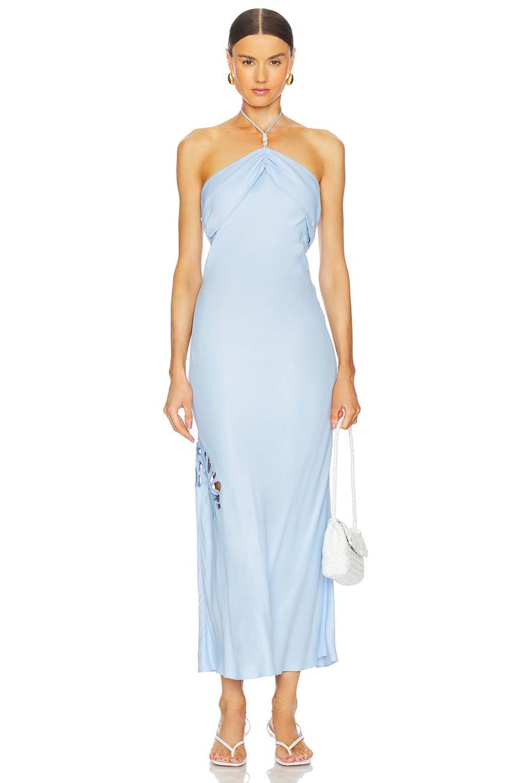 Soft viscose fabric and a sleek halter neck silhouette create a stunning figure-skimming slip dress in a serene light blue hue. The midi length offers elegant coverage, while the eyelet cut-out detail with delicate bead accents on the side adds a sophisticated and modern touch. Its back zipper and tie closure provide adjustable comfort and style. This dress is ideal for spring and summer occasions such as cocktail parties, date nights, and evening outings, blending effortless elegance with contemporary charm.