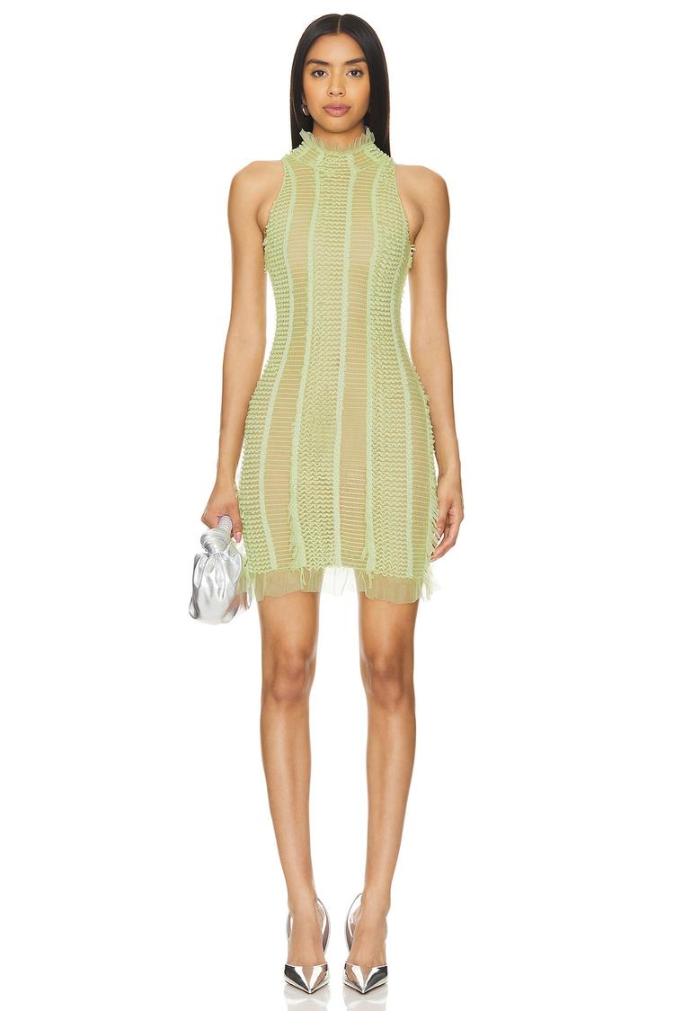 Soft gauze fabric and a slim shift silhouette combine in this light green mini dress with a high neckline and sleeveless design. Ruffled tulle details at the collar and hem add feminine texture, while the sheer fabric offers a modern, daring vibe. The dress features a pull-on style with a delicate back loop button closure, making it easy to wear for cocktail parties, night outs, or date nights in warmer seasons. Its elegant yet trendy look pairs perfectly with sleek heels and minimal accessories for sophisticated occasions.