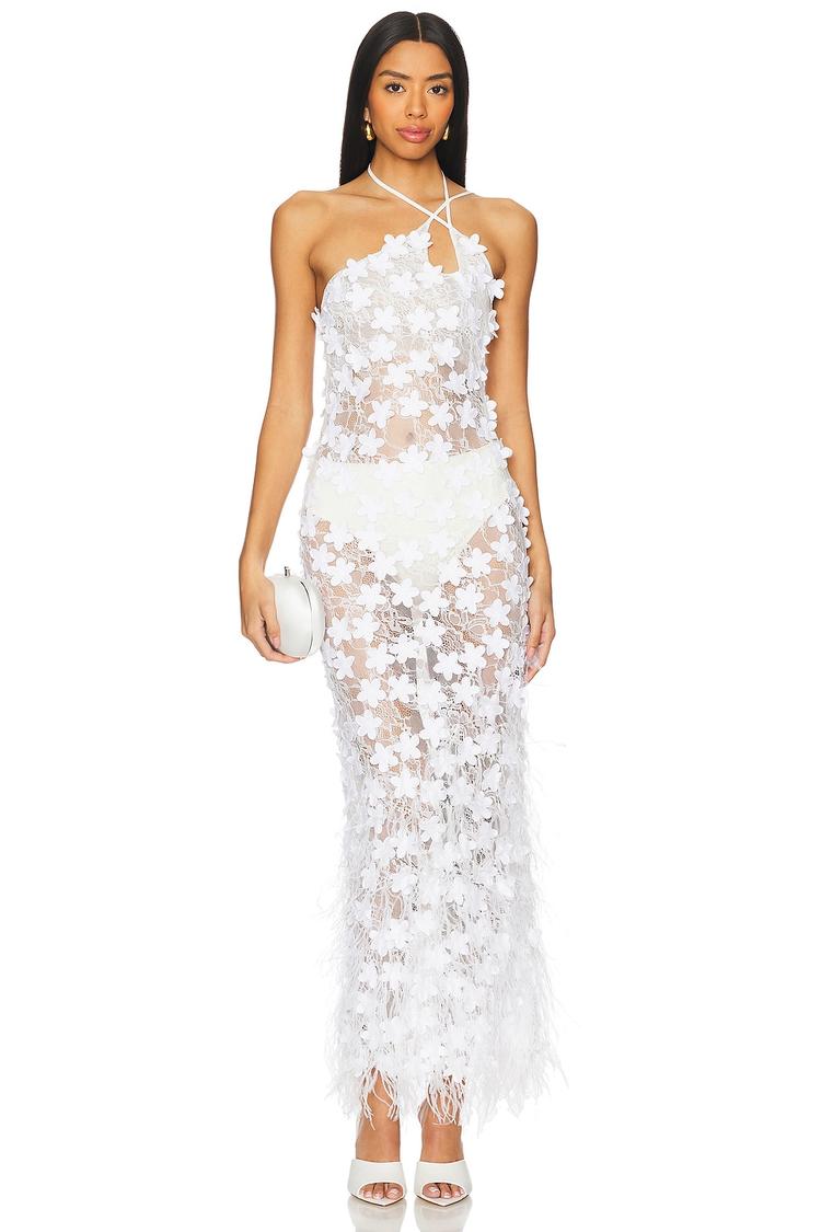 Delicate floral embroidery and lightweight lace create a romantic, figure-skimming column silhouette in this maxi dress. The adjustable halter neck and shoulder ties add a customizable fit, while faux feather trim along the hem lends a whimsical touch. Crafted from sheer polyester lace, this elegant white dress is perfect for cocktail parties, formal events, or date nights. Its hidden side zipper ensures a sleek closure, making it a sophisticated yet playful choice for spring and summer occasions.