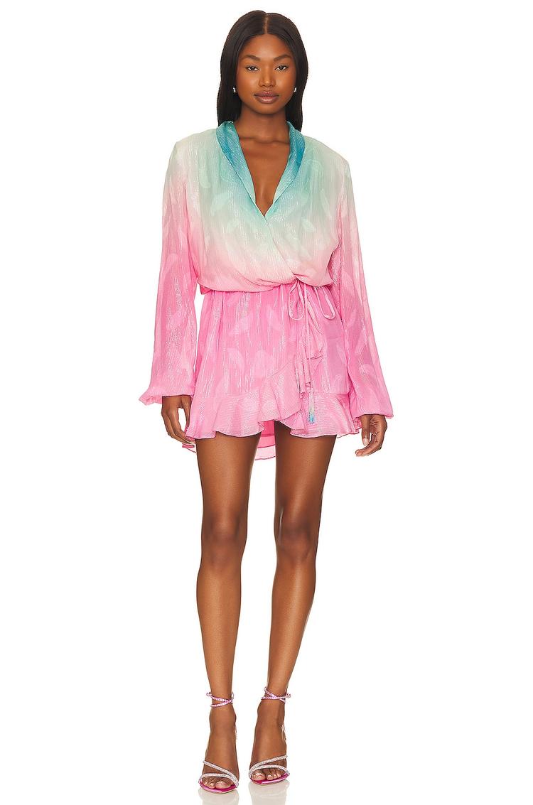 Soft viscose fabric enriched with metallic lurex threading creates a shimmering effect on this mini shift dress. Featuring a surplice neckline with snap button closure and long sleeves, it offers an elegant yet relaxed fit. The ruffled hem adds a playful touch while side tie closure with beaded ends enhances the sophisticated design details. Perfect for spring and summer brunches, date nights, and stylish evening outings, this versatile dress blends modern trendiness with effortless charm.