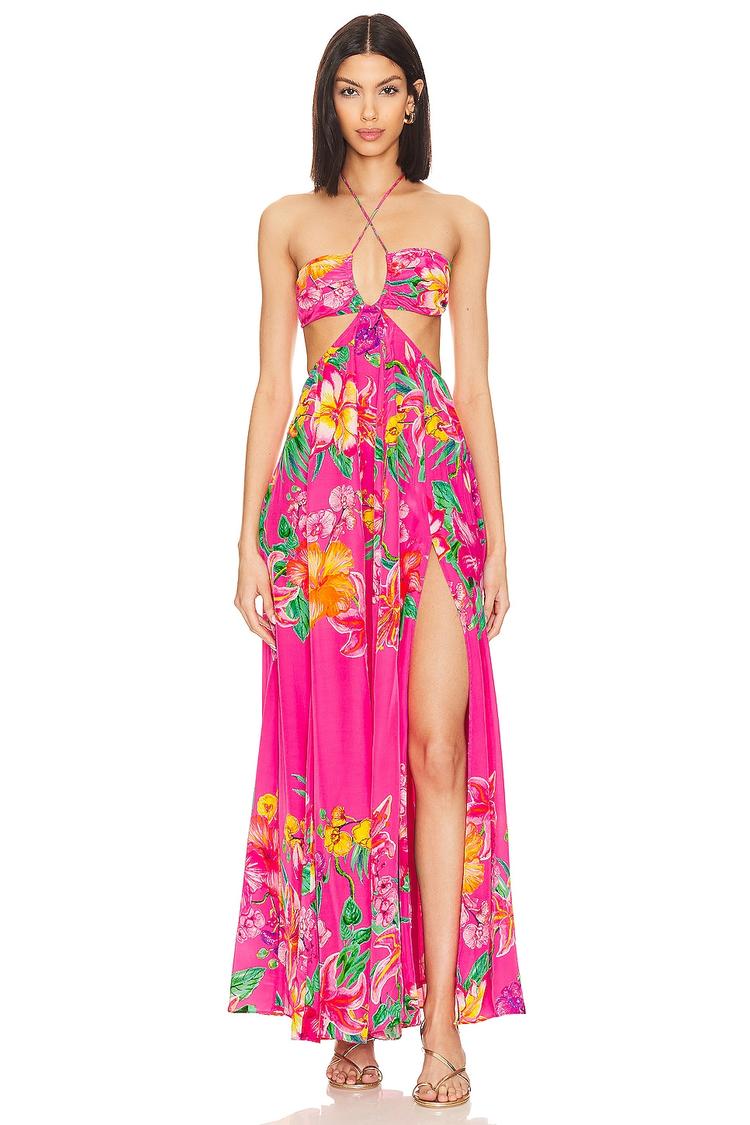 Bright pink floral patterns bloom across a flowing viscose maxi skirt, complemented by a halter neckline and tie-back closure for a flattering fit. The dress features alluring front and back cut-outs and a side slit that adds movement and breezy comfort. Lightweight and fully lined, this bohemian wrap dress is perfect for summer vacations, beach days, or vibrant date nights. Its effortless flow and bold colors make it an ideal choice for brunches and night outs, combining style and ease in one eye-catching silhouette.