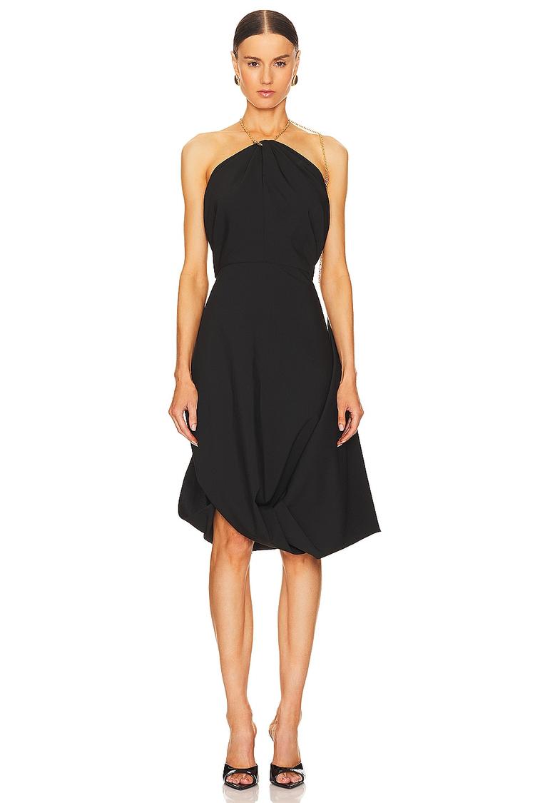 A sleek matte black halter neck dress features a fitted A-Line silhouette that elegantly skims to a clean knee-length hem. The sleeveless design and strapless styling highlight the neckline and shoulders, while a striking gold-tone chain with lobster clasp closure at the open back adds a sophisticated metallic detail. Crafted from a lightweight ponte fabric blend of polyester, viscose, and spandex, this dress offers subtle stretch and comfort. Ideal for cocktail parties, night outs, or date nights, it delivers modern elegance with a chic edge.