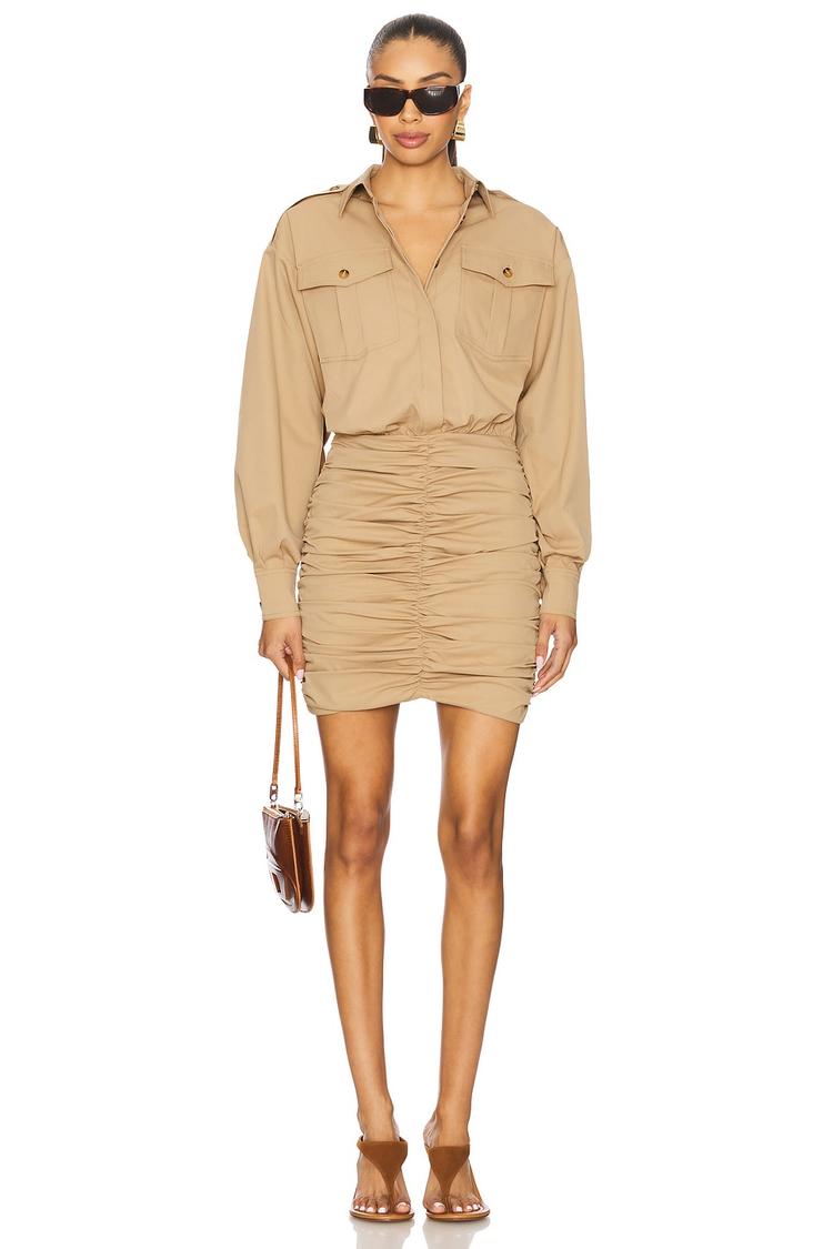 A structured shirt dress in matte beige poplin fabric combines modern elegance with casual chic vibes. The mini length and fitted silhouette enhance the body, while the long cuffed sleeves and classic collar add polished details. Unique ruching at the skirt creates subtle ruffled texture and movement, perfect for spring and autumn days. Featuring a hidden front partial button closure and side zipper, this versatile dress suits casual outings, brunches, and business casual settings with ease.
