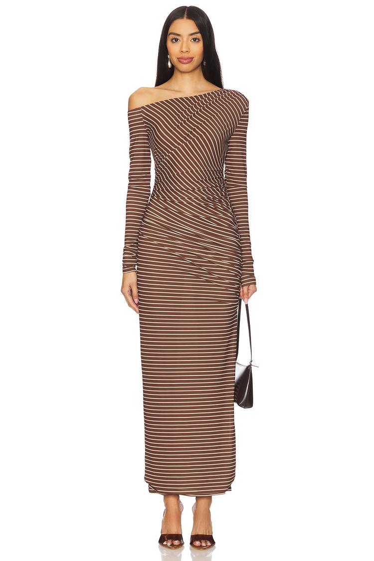 A sleek sheath silhouette with a daring off-shoulder neckline highlights modern sophistication in this maxi dress. Crafted from a stretchy jersey fabric blend of polyester and spandex, it features all-over black stripes on a matte brown base with elegant ruching details along the front and sides that flatter the figure. The long sleeves and concealed side zipper ensure a seamless fit, making it an ideal choice for cocktail parties, date nights, or stylish nights out. This chic design combines comfort with a contemporary edge for versatile all-weather wear.